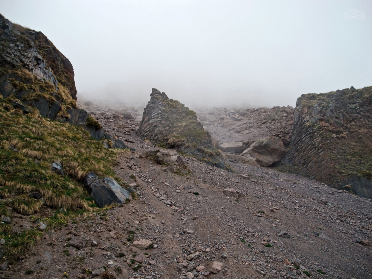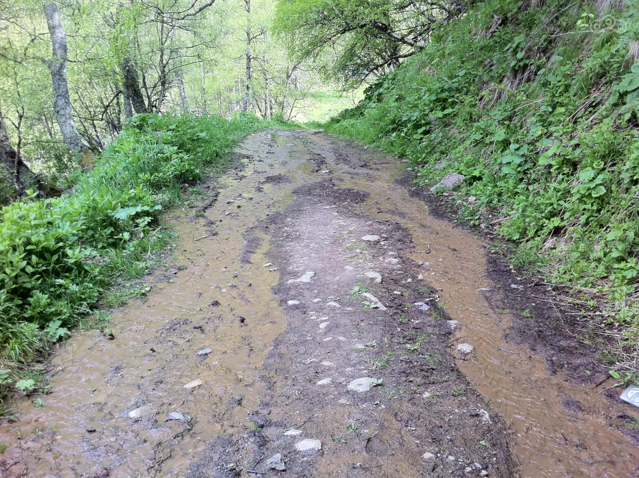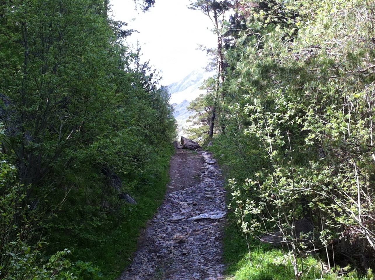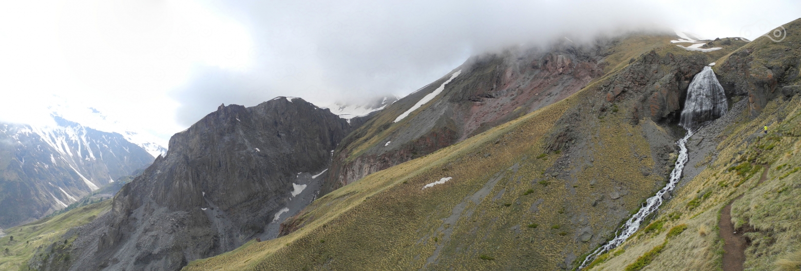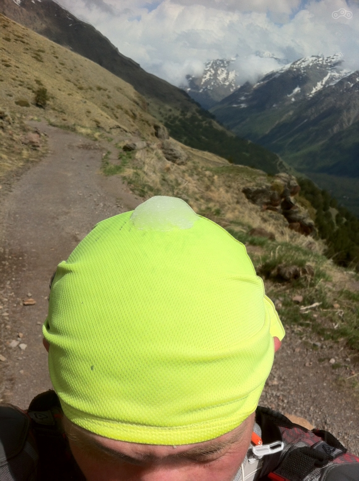 После коровника начался довольно крутой грунтовый серпантин с разворотами и одновременными подъёмами. На дороге часто встречались пешеходы с трекинговыми палками, как правило без рюкзаков, но в довольно тёплых куртках. Поднявшись на 2569 метров (согласно GPS), мне пришлось бросить мотоцикл на небольшом пятачке, потому что дальше был обвал дороги, осталась довольно узкая тропа, густо усыпанная камнями, которые так и норовили убежать из под ног. Проехать там в одиночку на изношенной полуасфальтовой резине с багажом (оставить часть багажа в гостевом доме я не догадался) я не рискнул. Был некоторый шанс улететь вниз вместе с мотоциклом. Хотя будь я в компании, я бы попробовал, тропа была достаточной ширины и шансы на успех мероприятия тоже были. Я повесил замок на тормозной диск и пошёл дальше пешком. Погода была переменчивая, менялась каждые 10 минут. Солнце то жарило, то пряталось за облака, и дул мягко говоря освежающий ветерок. Лето в этом году итак не задалось по погоде, а на такой высоте и того было порядка 14-16 градусов днём и около 6-8 градусов ночью (почему собственно в гостинице и работало отопление). Пройдя около километра, я осознал, что я снова лоханулся и не взял питьевую воду, а солнышко заметно пригревало. Я снял верхнюю футболку, обмотал её вокруг головы и положил сверху снежок из попавшегося очень кстати сугроба. Получилась этакая освежающая шапочка, которая, кстати, совсем не торопилась таять.