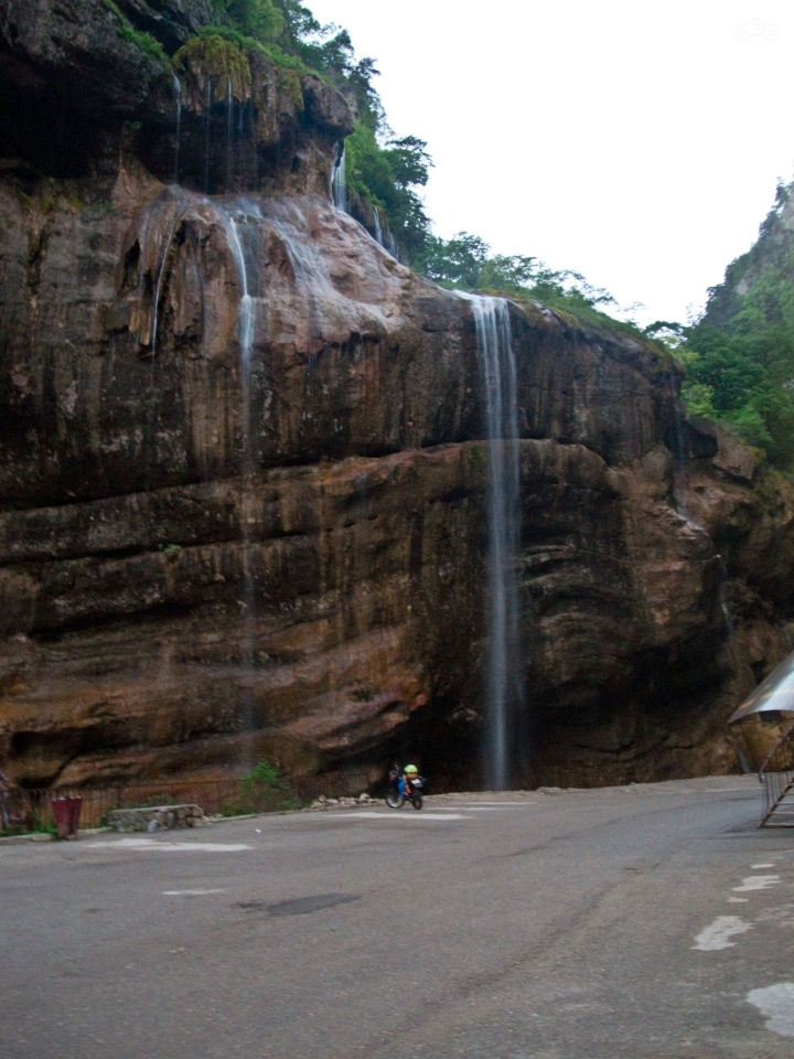 Вернувшись к повороту, я решил собрать в себе силы, коих оставалось не много (на такой высоте любая физнагрузка даётся с трудом, а я вообще совсем не в хорошей физической форме сейчас), и подняться ещё выше к обсерватории, на высоту около 3000 метров. Топать туда предстояло около километра, но оттуда как раз спускались двое парней с палками и они меня отговорили от этой затеи, т.к. я был легко одет, без палок и воды, а наверху, по их словам, снега чуть ли не по пояс. Я поделился «картинкой» про наблюдавшего на нас с водопада тура, на что мне рассказали, что оказывается, туры не умеют ходить задом. Когда они лезут по скалам всё выше и выше, то в определённый момент попадают в ситуацию, кода дальше лезть некуда. Тогда они прыгают головой вниз, а их рога выступают в качестве амортизаторов при приземлении. Я уж не знаю, на сколько это правда, но на тот момент мне это показалось правдоподобным – я впитывал всё окружающее с восторгом и доверчивостью ребёнка. Я отметил, что у мотоцикла тоже нет задней передачи. Ребята переглянулись, но промолчали.