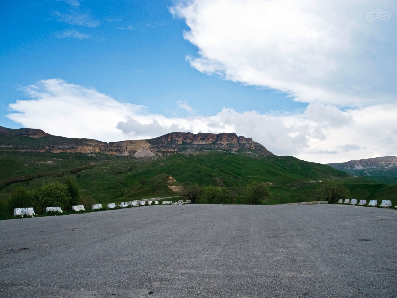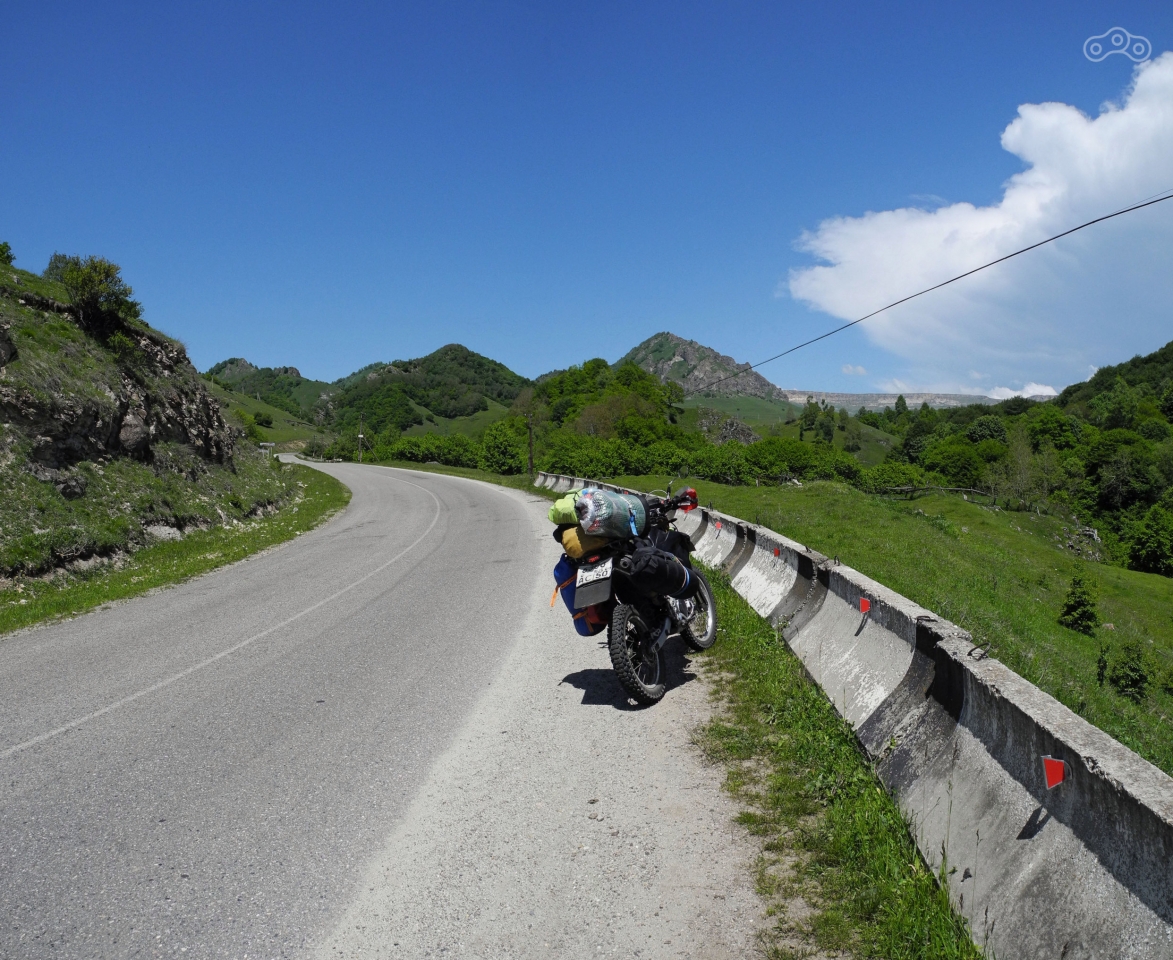 Очень напрягали периодически попадавшиеся дорожные работы. Асфальт укладывали и тут же открывали для проезда, потому что вариантов объехать не было. В результате мотоцикл медленно, но верно продолжал покрываться чёрными точками. За Тырныаузом на укреплённом блок-посту, охраняемом солдатами с автоматами, мне махнул палочкой инспектор ДПС. Я остановился и уже приготовился доставать документы, когда услышал фразу «Ну что, Москва, домой двигаешь?». Тут меня чёрт дёрнул сказать инспектору правду, что я еду в Нальчик в банкомат. Никогда не давайте инспектору ДПС понять, что у вас есть деньги! Дошло до меня это правда только потом, как и некоторые другие нюансы знаменитого «кавказского гостеприимства». Инспектор удивился, зачем тащиться в такую даль, если у них есть банкоматы, но я сказал, что во-первых мне нужен банкомат ВТБ24 (Сбербанковский-то банкомат и в Терсколе есть), а во-вторых банкомат тут только повод для того, чтобы прокатиться и полюбоваться красотами Баксанского ущелья. Он меня отпустил и я помчал дальше. По пути пару раз пытался начаться мелкий дождь, но всё ограничилось небольшой моросью, после чего солнце снова выглянуло, а поскольку я спускался относительно уровня моря, то становилось заметно теплее.
