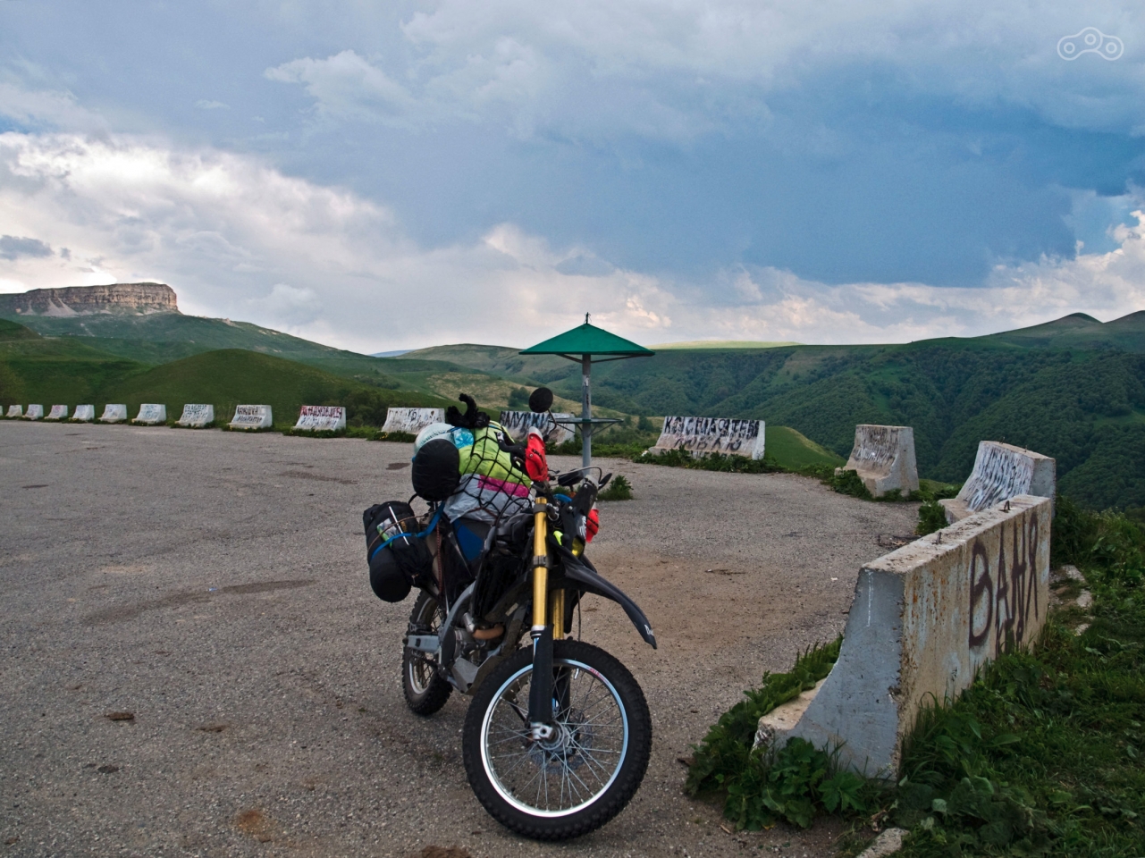 Я давно не спал так крепко и сладко, а вид из окна на утро придал бодрости и хорошего настроения. Первое, что я сделал с утра, это связался с Лёхой, который знает эти места как свои пять пальцев. Он порекомендовал мне в качестве жилья частный гостевой дом во дворе возле кафе Байрамук, а также накидал несколько точек в этой местности, куда можно было попробовать забраться на мотоцикле. Я не спеша собрался, перекусил омлетом (еда в Куполе не очень дешевая) и поехал договариваться насчёт жилья. Когда я подъехал к Байрамуку, стоявшая там женщина приняла меня за сына Розы и Исхака - видимо она знала, что он мотоциклист, но не видела его, т.к. мы со всем не похожи. В этот момент там стояла машина замдиректора национального парка Приэльбрусье. С подачи этой женщины, выяснилось, что проезд на Джилы-су со стороны Баксанского ущелья существует (через Тырныауз), но в июле там уже начнут ставить запрещающие знаки. Я сделал себе отметку, что надо обязательно прокатиться по этой дороге, пока не запретили.