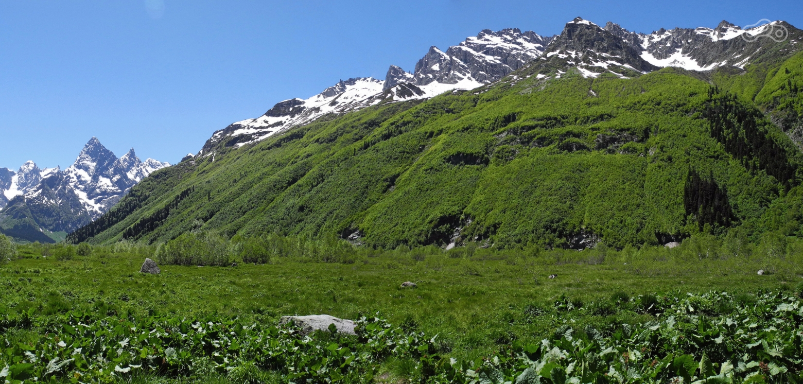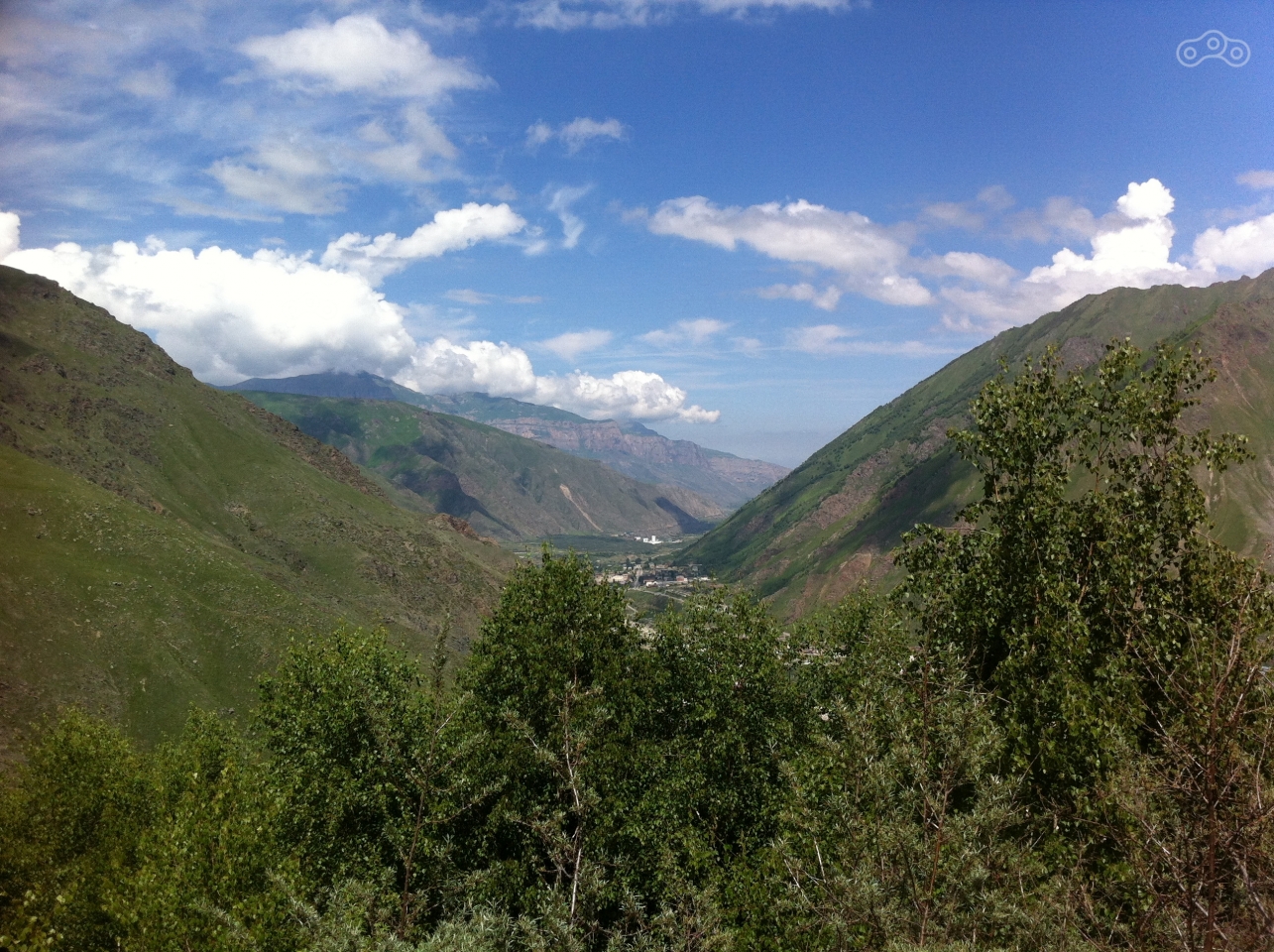 На утро третьего дня я осознал, что меня задолбали дубак и скукота, мне надоело только жрать и спать. Я не люблю «овощной» отдых, он утомляет больше, чем работа. Я совершенно не знал, чем заняться, да и еда уже заканчивалась. Идти в горы после дождей не хотелось, потому что в тапочках и без трекинговых палок по мокрому чернозёму я бы далеко не ушёл, а мотоботы уже третий день никак не могли высохнуть после брода на перевале. Так же третий день не сохли постиранные в роднике носки, такая стояла влажность от дождей. На мотоцикле на мокрую гору тоже не особо заедешь – задний баллон совсем «загрустил» и хотел только асфальта. Погода слегка улучшилась, но менялась каждые 10 минут – то выглядывало солнце, то снова налетали низкие тучи. Я сходил ещё разок искупался напоследок в купальне, набрал бутылку воды из «желудочного» нарзана и стал собираться в дорогу. У меня оставались ещё два пункта, которые я хотел посетить в этом регионе – Домбай и Архыз. Поэтому я поехал в сторону Кисловодска по наверное самому идеальному асфальту в этой части Северного Кавказа.