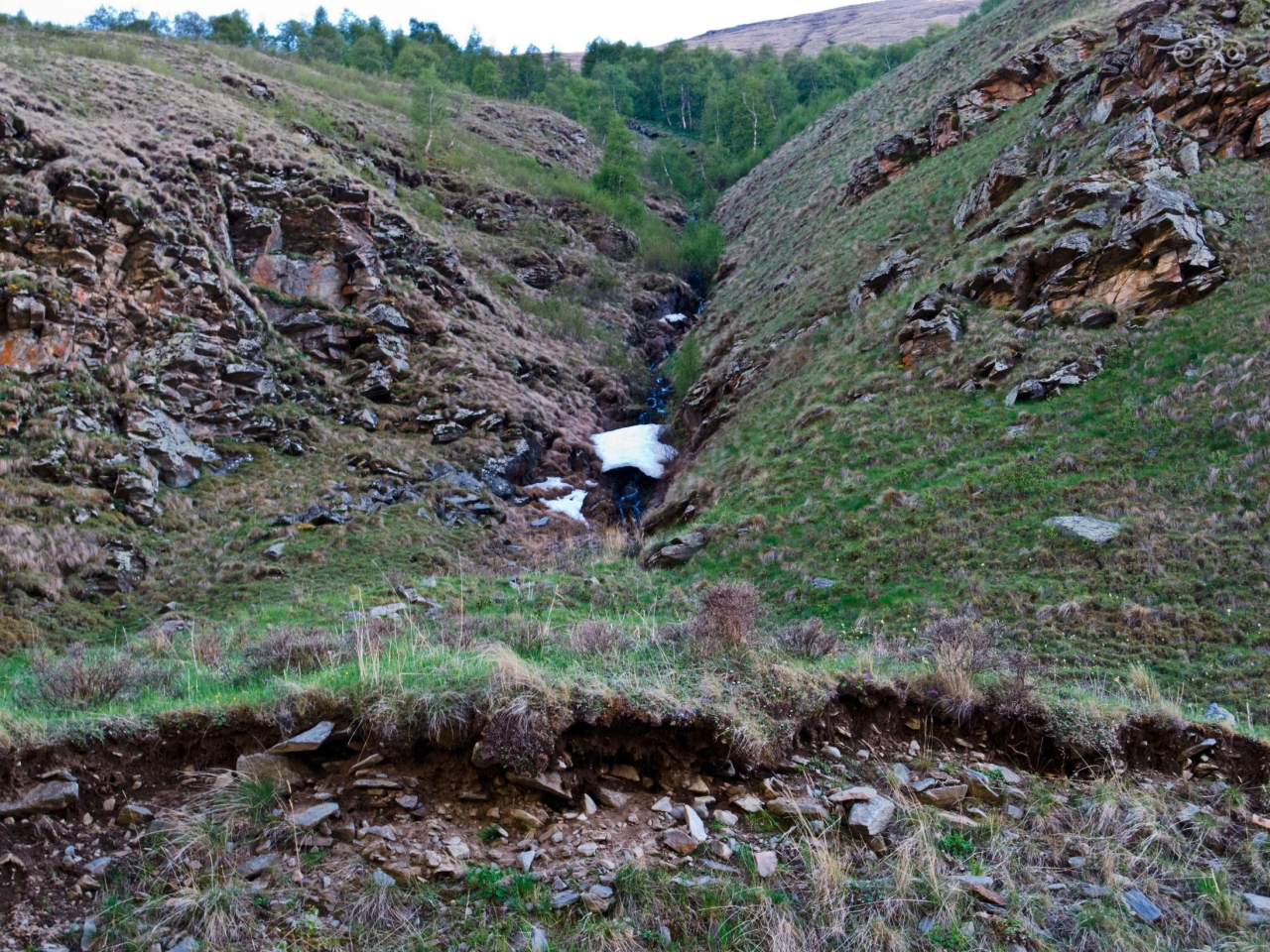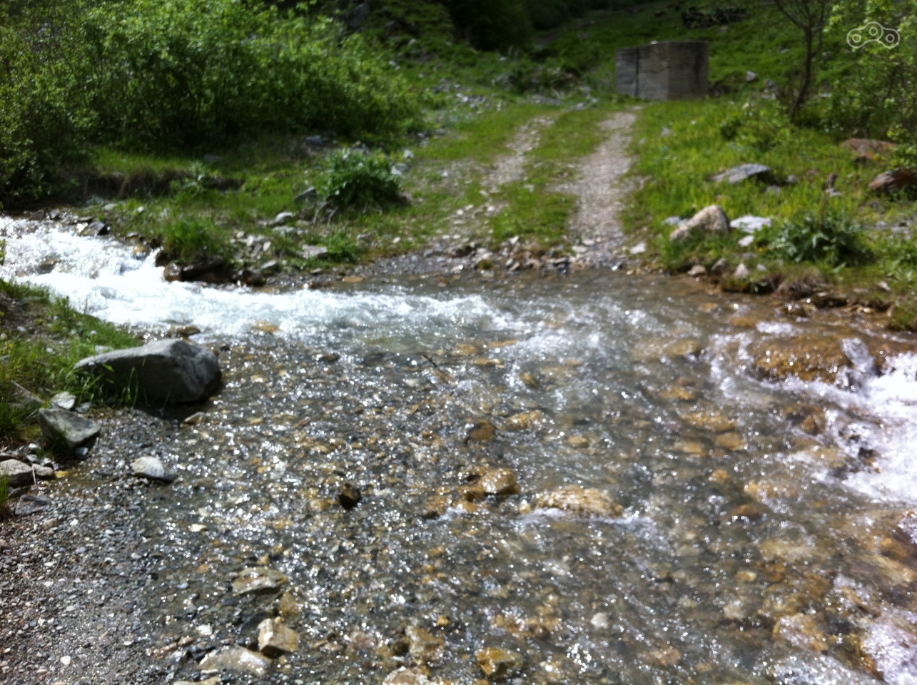 После разговора я продолжил подниматься, пока не доехал до развилки, от которой уходили более слабо накатанные следы направо в лес. Ахмат говорил мне об этой дороге. Если поехать по ней, то можно изрядно сэкономить времени, перебравшись на правую часть хребта через пару ручьёв. Однако на поверку ручьи оказались не такими уж и ручьями. То, что легко преодолевается на уазике, мне оказалось не по зубам. Я попробовал перебраться через первый ручей, который оказался в середине глубиной сантиметров 30 и с довольно бурным течением. Спасло то, что я не ехал, а вёл мотоцикл «под уздцы», иначе я бы его там утопил. При этом я начерпал прилично воды в мотоботы в процессе переправы, когда мотоцикл стало смывать течением прямо на меня. Через 50 метров оказался другой ручей, ещё более бурный. Я стоял и разглядывал ручей, ища место, где можно было попробовать переправиться, когда с другой стороны прибежал кавказский парнишка лет 25 в сандалиях. Он предложил мне чаю, но я отказался. Парень рассказал, что они пасут там скот, пригоняя его туда. Я удивился, мы пожелали друг другу удачи, и я стал выбираться обратно на основную дорогу.