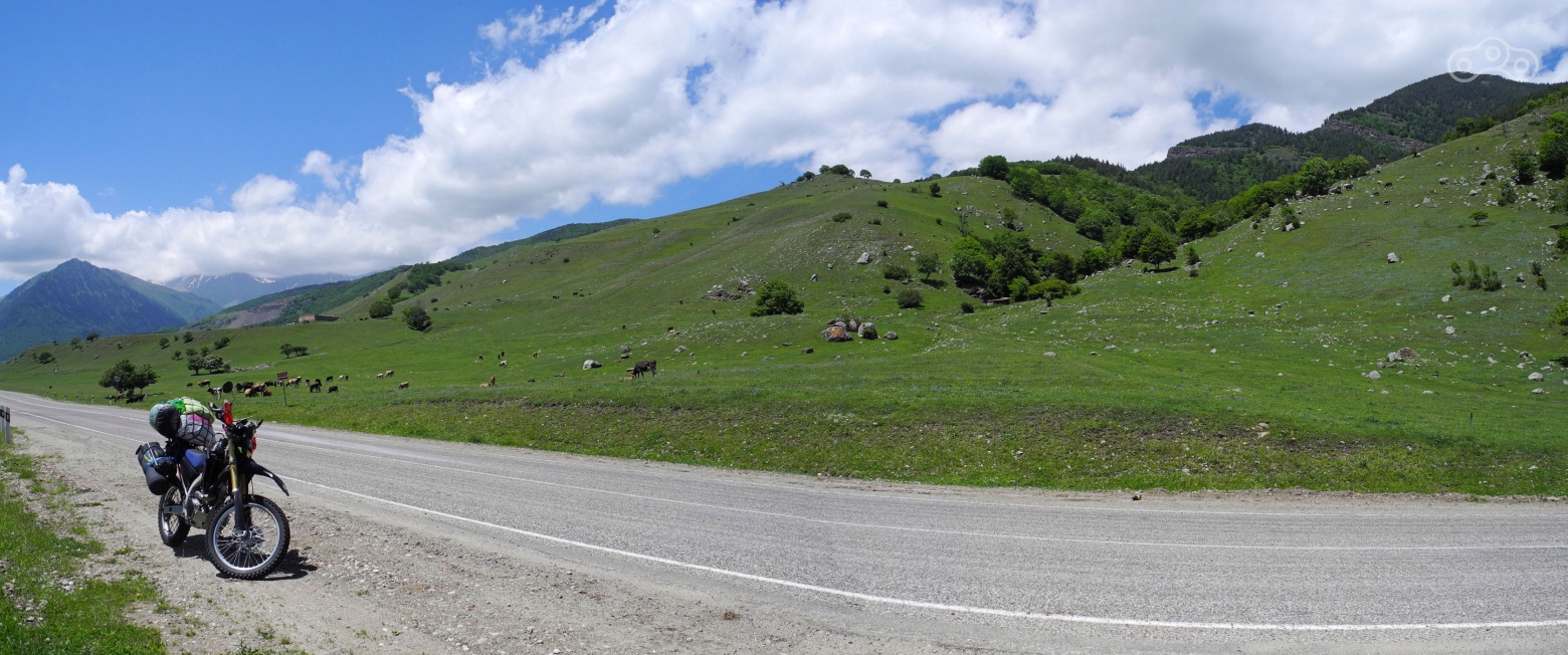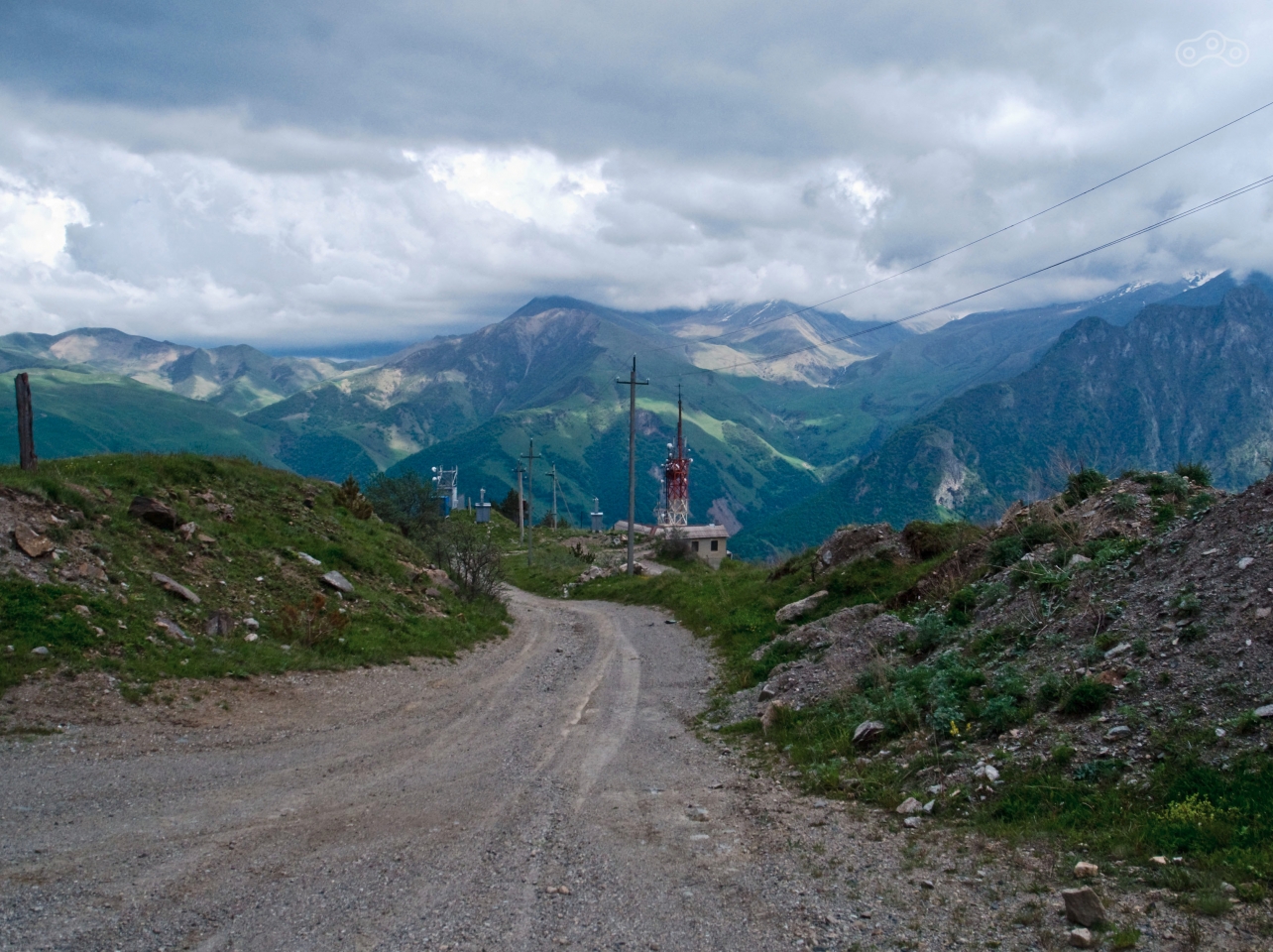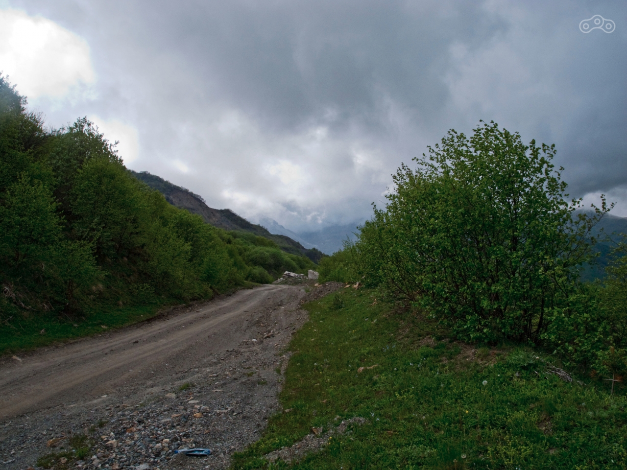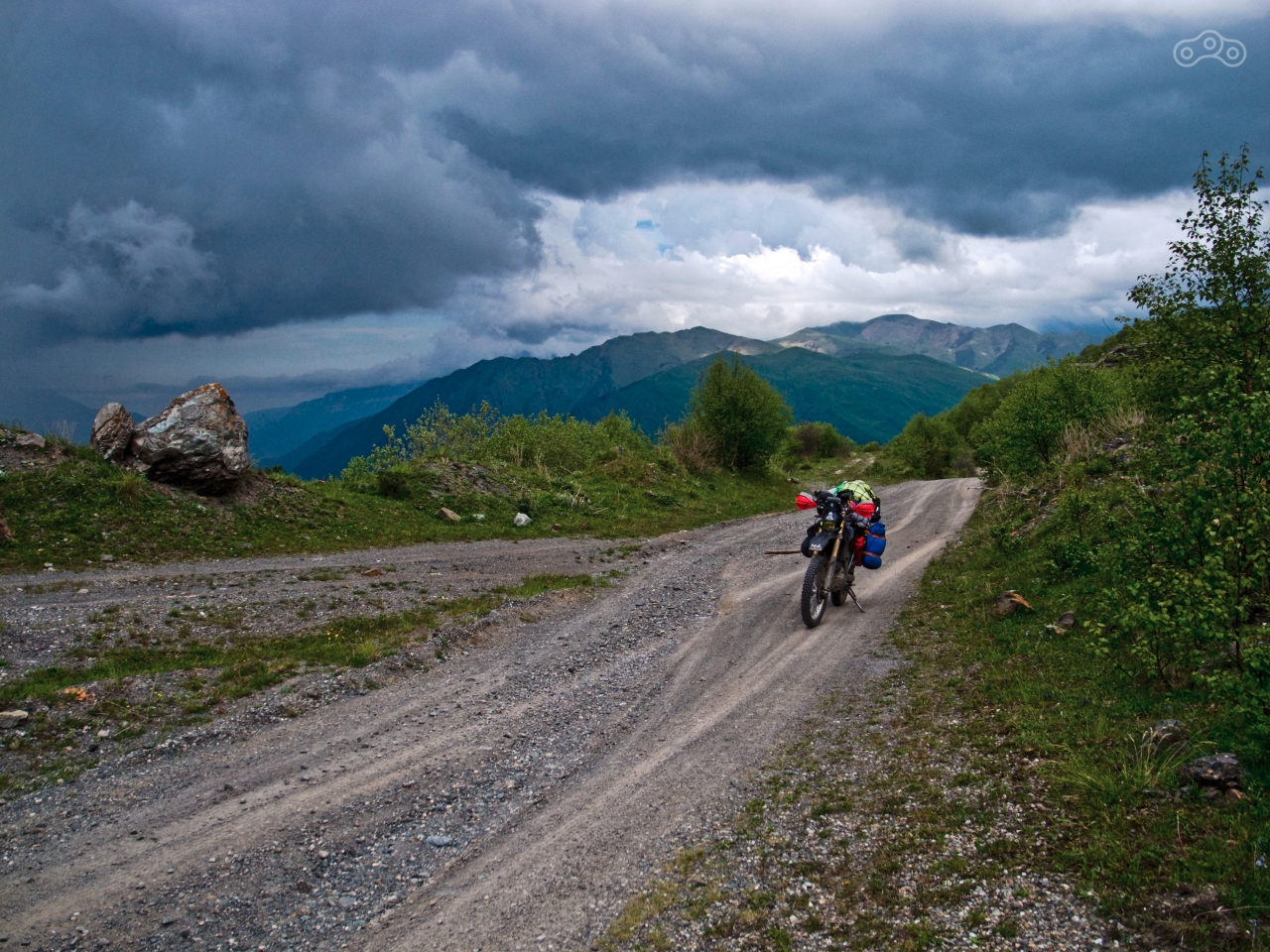 Когда я выехал, снова светило солнце, но было прохладно. Пару раз налетал сильный ветер и пытался накрапывать дождь. На АЗС ГПН я запаковался в дождевик, но он так и не пригодился – всё ограничивалось лёгкой моросью. Я промчал уже знакомый перевал Гум-Баши через Верхнюю Мару, обогнув все дождевые тучи (ну может пара капель на меня попала). Пока наваливал по перевалу, в одном местечке чуть не вылетел на встречку в повороте. Причём мне на встречу тоже совсем не медленно шёл красный пикап (Ford если не путаю). Я не стал строить из себя гонщика и закладывать в повороте на такой разбитой дороге, вместо этого ушёл на встречную обочину. А ещё почти на вершине перевала Гум-Баши мне навстречу проехал ещё один мотопутешественник. Он был на навьюченной лёгкой эндуре с чёрной фарой, оранжевыми «лопухами» и толи в серебристом, толи в белом шлеме-интеграле. Останавливаться мы правда оба не стали, отделались приветствием, т.к. крутой поворот на перевале не лучшее место для остановки, да и обочины в этом месте толком не было.