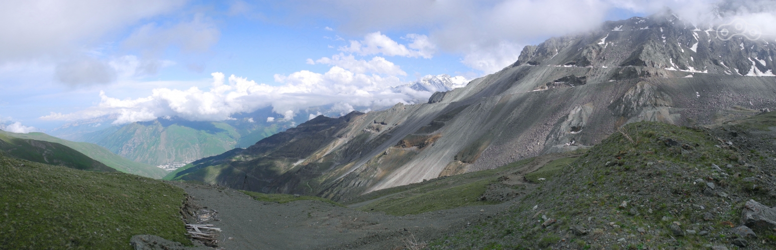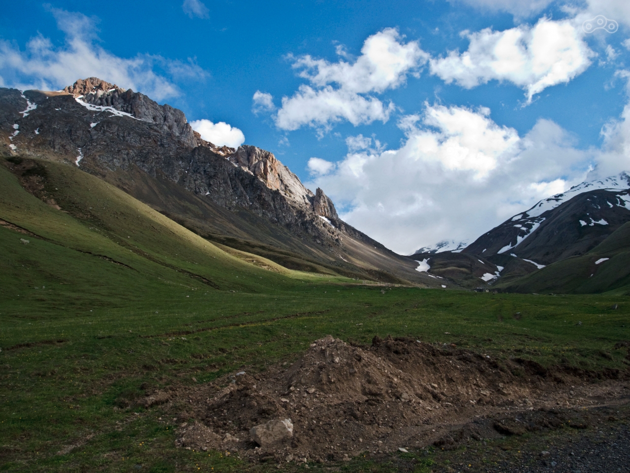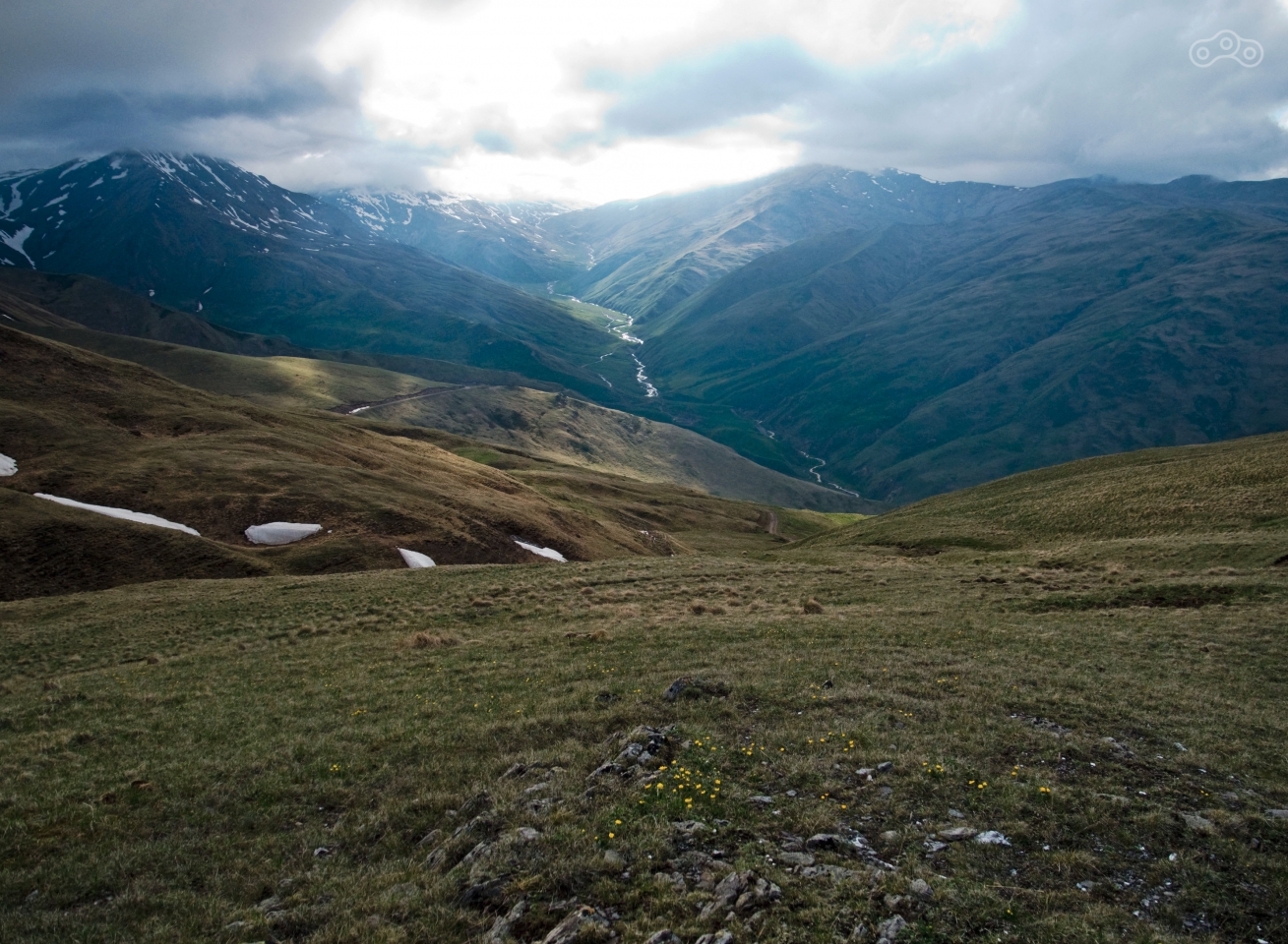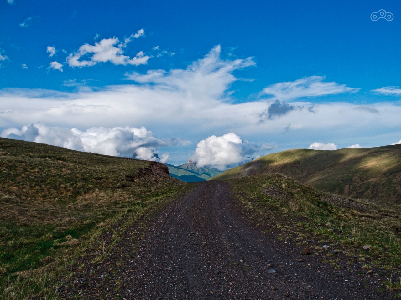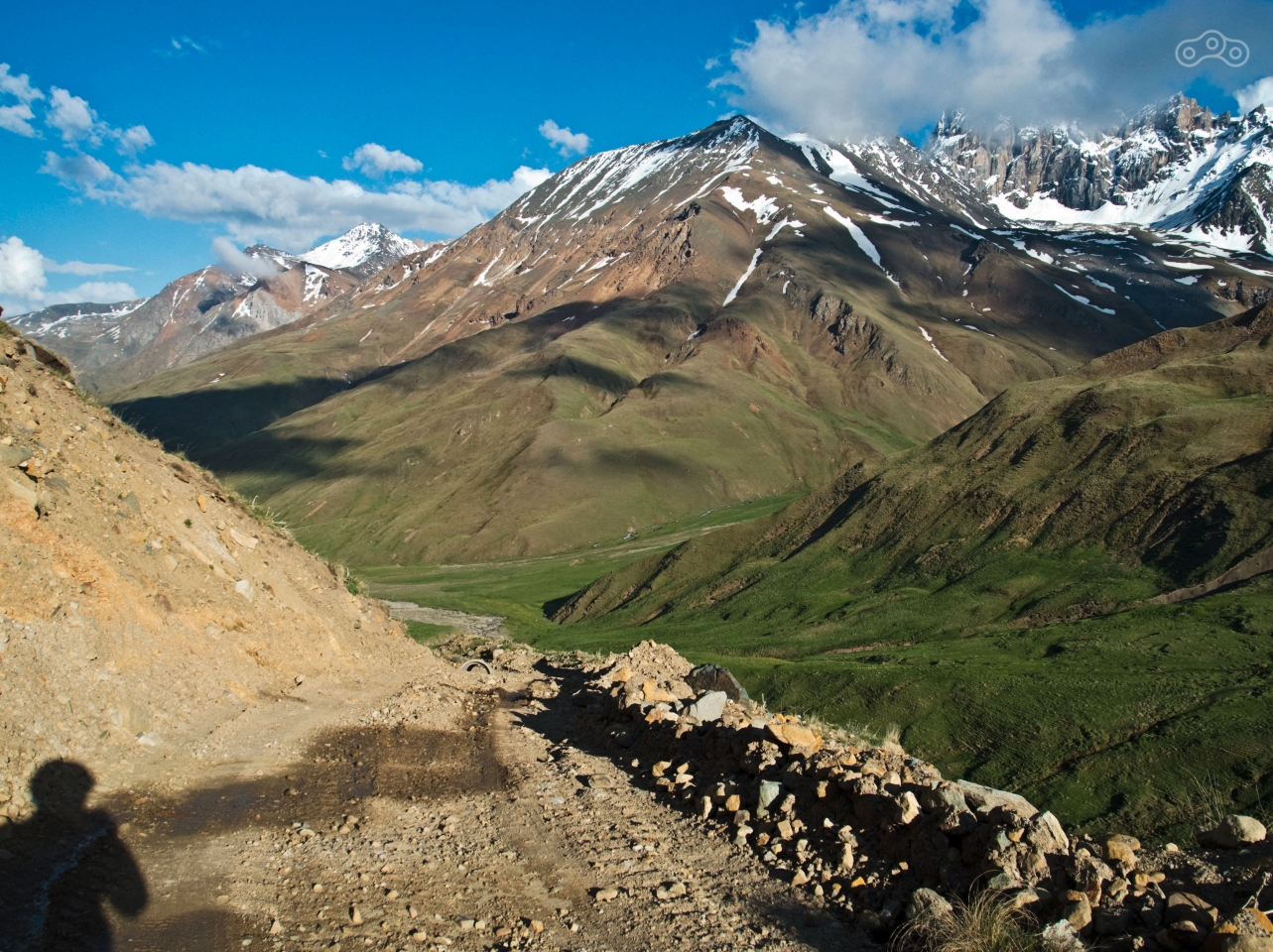 Когда я выехал, снова светило солнце, но было прохладно. Пару раз налетал сильный ветер и пытался накрапывать дождь. На АЗС ГПН я запаковался в дождевик, но он так и не пригодился – всё ограничивалось лёгкой моросью. Я промчал уже знакомый перевал Гум-Баши через Верхнюю Мару, обогнув все дождевые тучи (ну может пара капель на меня попала). Пока наваливал по перевалу, в одном местечке чуть не вылетел на встречку в повороте. Причём мне на встречу тоже совсем не медленно шёл красный пикап (Ford если не путаю). Я не стал строить из себя гонщика и закладывать в повороте на такой разбитой дороге, вместо этого ушёл на встречную обочину. А ещё почти на вершине перевала Гум-Баши мне навстречу проехал ещё один мотопутешественник. Он был на навьюченной лёгкой эндуре с чёрной фарой, оранжевыми «лопухами» и толи в серебристом, толи в белом шлеме-интеграле. Останавливаться мы правда оба не стали, отделались приветствием, т.к. крутой поворот на перевале не лучшее место для остановки, да и обочины в этом месте толком не было.
