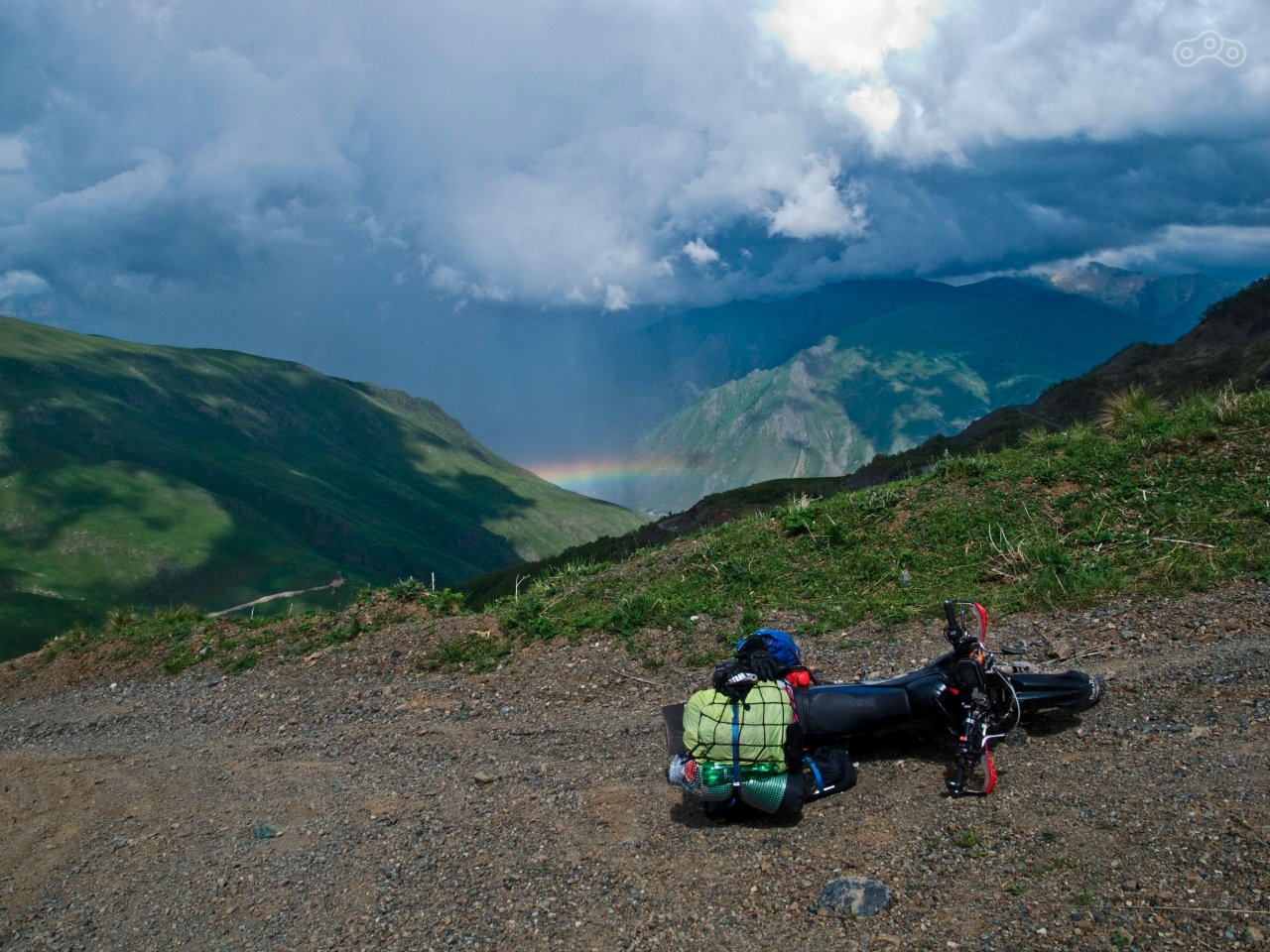 Тем временем правую часть хребта, куда я так и не перебрался, стало затягивать тучами, а кое-где даже видно было, как льёт дождь. При этом на левой части хребта светило солнце и было сухо. На очередном очень крутом повороте с сильным уклоном я решил остановиться, но не удержал мотоцикл и завалил его на бок. Сам при этом не упал, кстати. Развернувшись, чтобы поднять мотоцикл, я увидел внизу в долине над Тырныаузом радугу. Причём я к тому моменту находился выше радуги, почти на одном уровне с облаками. Ну или по крайней мере так показалось, если это конечно не оптическая иллюзия, потому что в горах расстояния и углы ощущаются иначе. То, что кажется в 5 минутах ходьбы, на самом деле может оказаться в 5 километрах. Место, где я завалился, было развилкой. Дороги уходили прямо и направо. Помятуя указания Ахмата выбирать всегда правое ответвление, я повернул направо и продолжил подъём. Слева же виднелись многочисленные шахты, а одна из них даже дымила чёрным дымом, и с её стороны были слышны гулкие шумы. Я захотел подъехать посмотреть, что же это такое шумит, но проехав буквально сотню метров, увидел, что возле шахты работает тяжелая техника, просто её было не видно за одним из холмов. Возле дороги валялся кусок мешка, на котором лежали чёрно-зелёные стержни.