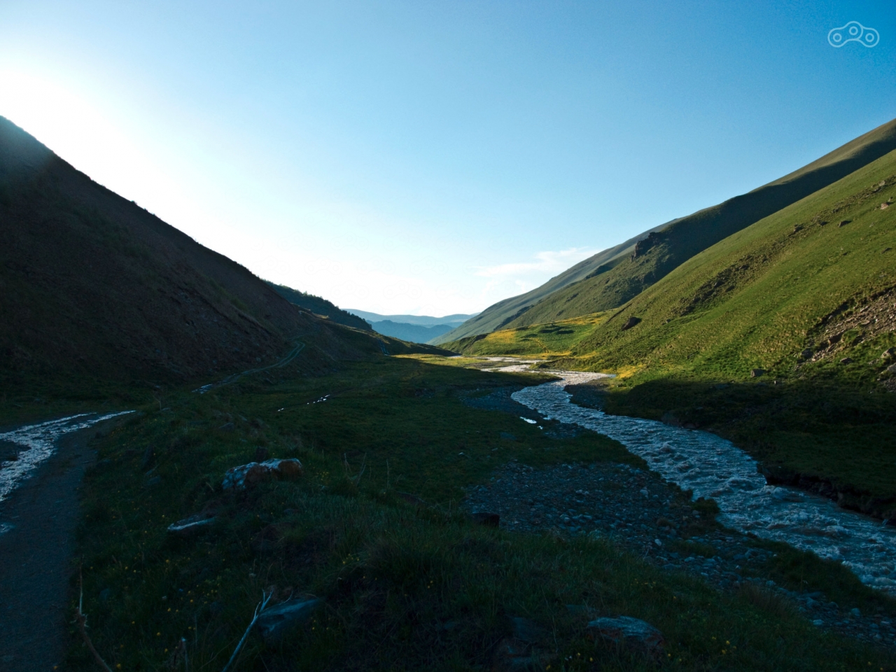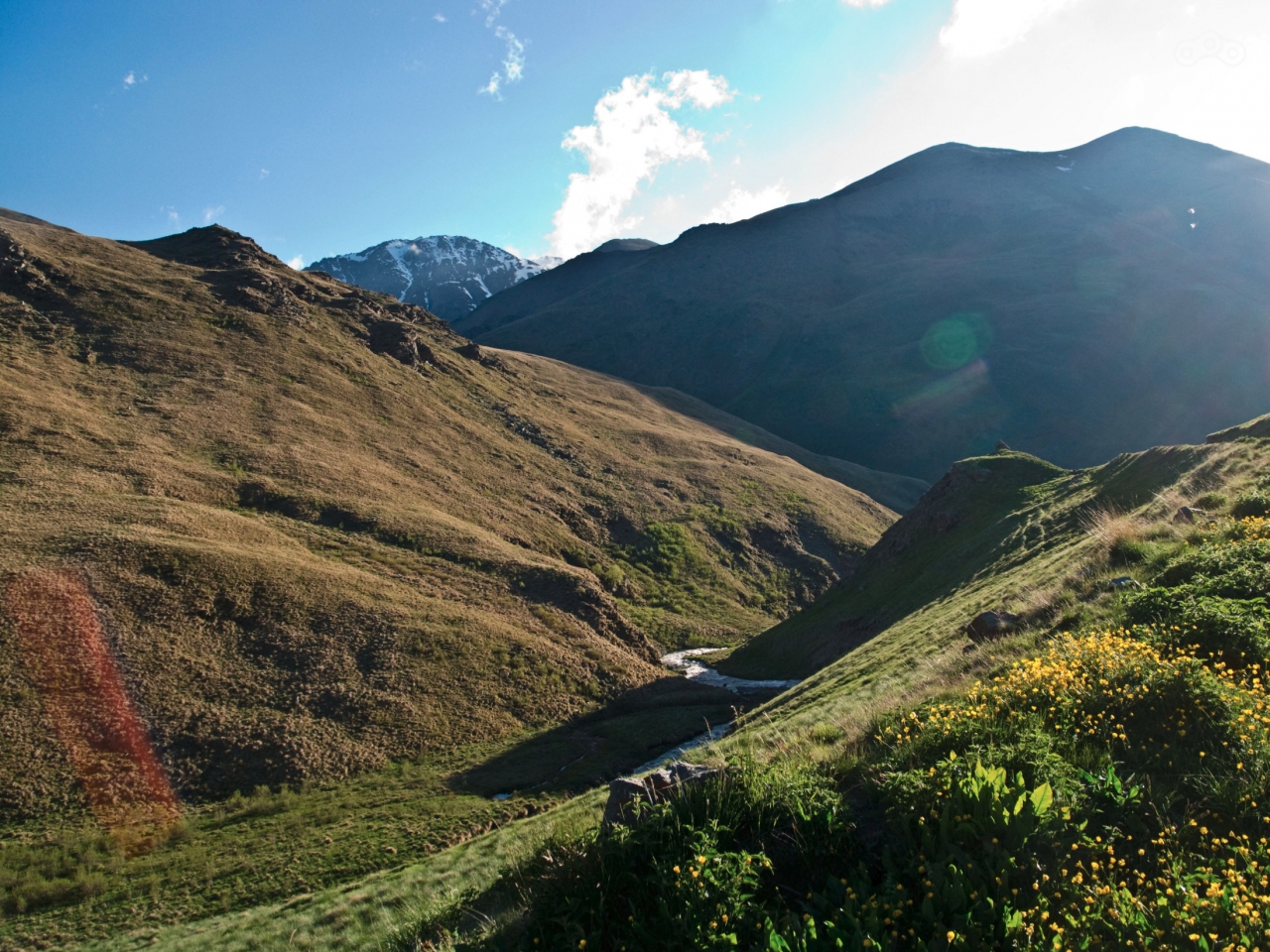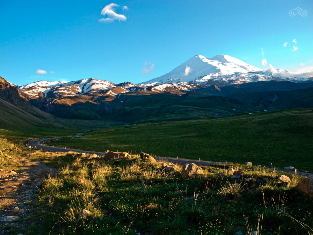 Дальше крутизна склона не сильно изменилась, но зато дорога была уже ровнее и более утрамбованной, поэтому я довольно быстро забрался наверх, после чего снова начался пологий уже спуск с довольно укатанной дорогой вдоль бурной горной реки и зелёных с желтыми цветочками лугов, просто восхитительно смотревшихся в лучах вечернего солнца. Солнце уже основательно снизилось, скрывшись за холмом, когда я упёрся в небольшой обвал на дороге. Слева струился ручей, уходивший в землю. Справа вдоль реки в траве были колеи объезда, но в конце они завершались наикрутейшим подъёмом по чернозёму, по которому струились множество ручьёв, поэтому для меня это был совершенно не вариант. Пришлось спешиться и немного покидать камни. Благо у меня мотоцикл узкий и маневренный, я за 10 минут расчистил приемлемую траекторию и стал снова подниматься. Перевалив через очередную гору, я наконец увидел долину нарзанов Джилы-су и двуглавый снежный пик Эльбруса. А ведь я даже не знал, что у Эльбруса две вершины до этого дня! К самой долине по ущелью шла отличнейшего качества асфальтовая дорога. Мне невольно вспомнился мем из интернета с целующими асфальт мотоциклистами и подписью «Асфальтик, любимый, как же я по тебе скучал!» )))) Весь путь от Терскола, а это всего 85 км, если верить навигатору, занял у меня порядка 6 часов. Правда я совсем медленно тошнил в прогулочном режиме, дабы не насиловать мотор и не рисковать где-нибудь разложиться в одиночку.