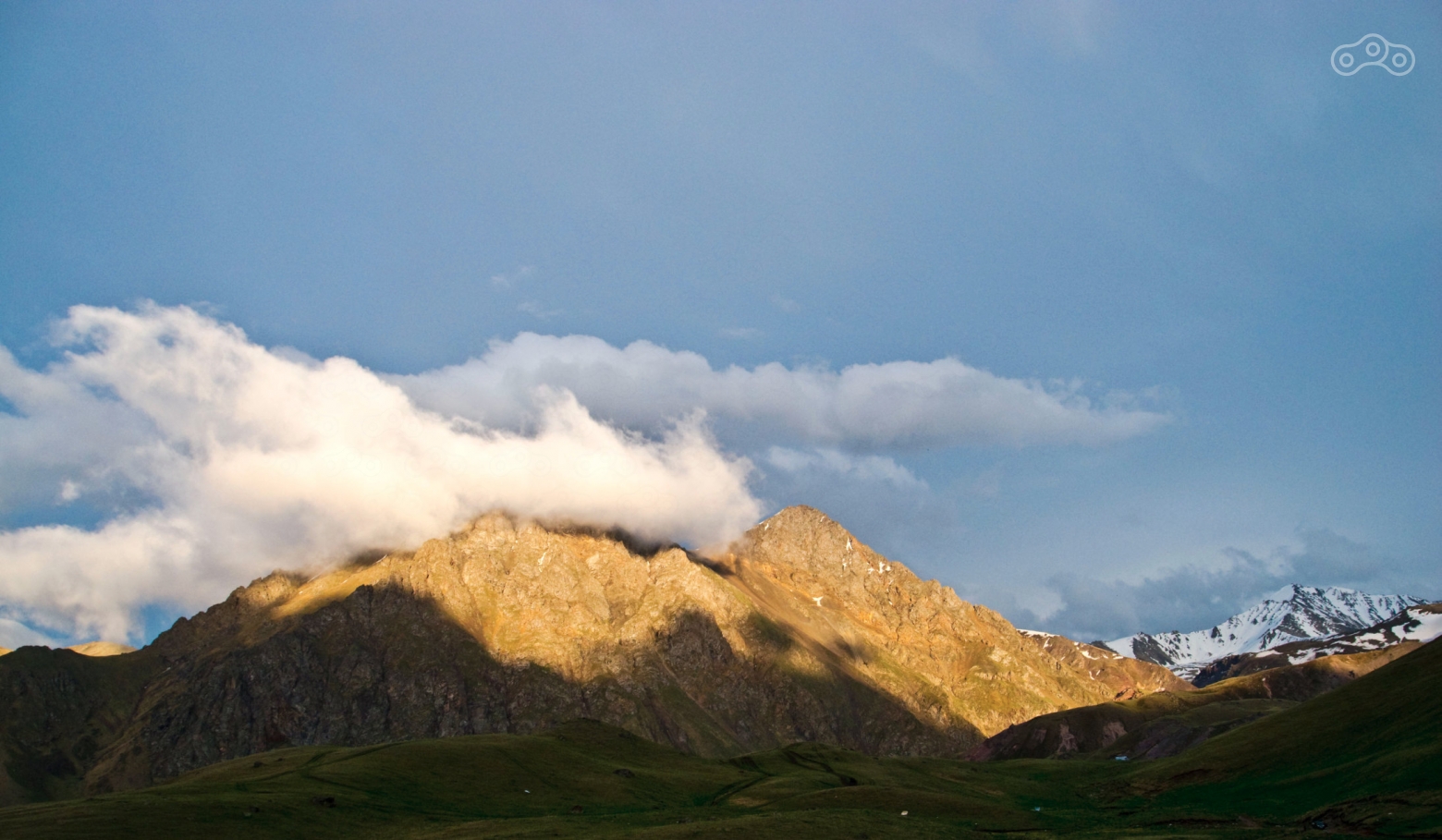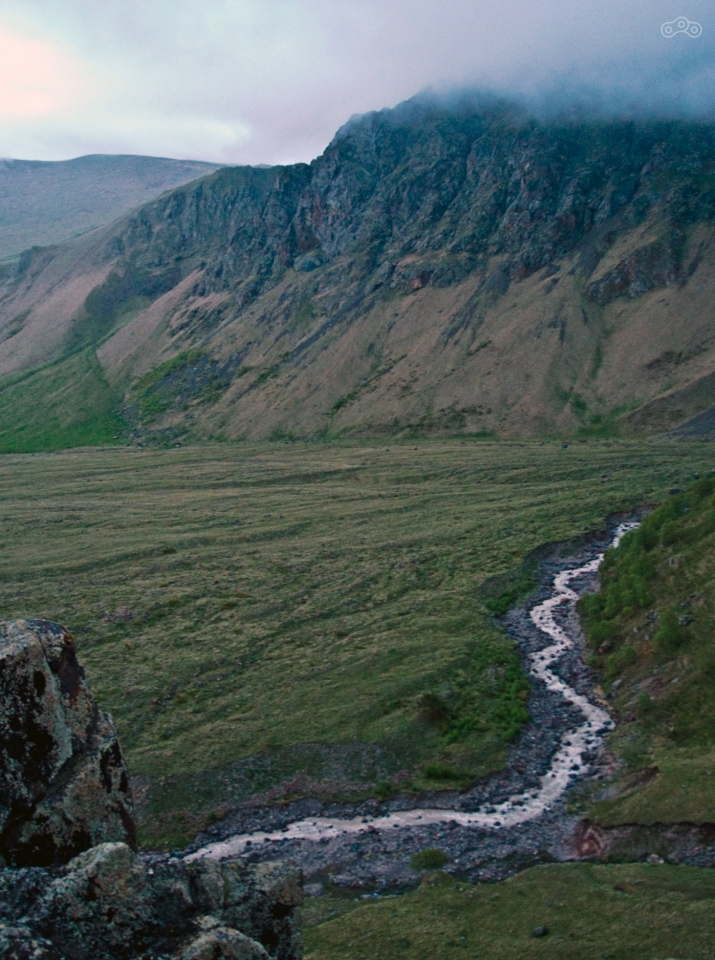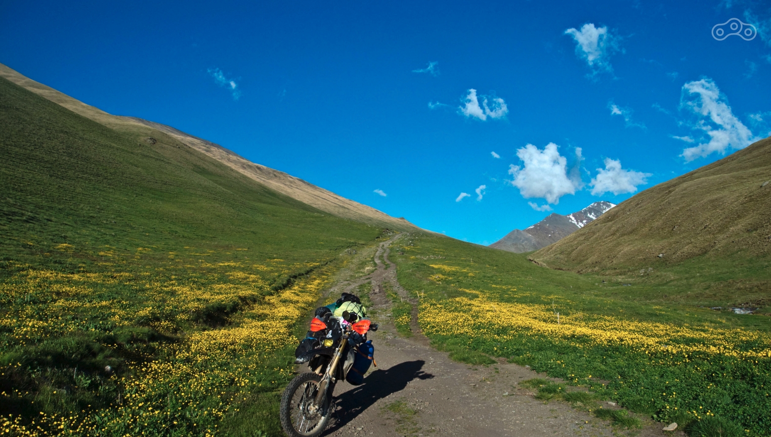 Дальше крутизна склона не сильно изменилась, но зато дорога была уже ровнее и более утрамбованной, поэтому я довольно быстро забрался наверх, после чего снова начался пологий уже спуск с довольно укатанной дорогой вдоль бурной горной реки и зелёных с желтыми цветочками лугов, просто восхитительно смотревшихся в лучах вечернего солнца. Солнце уже основательно снизилось, скрывшись за холмом, когда я упёрся в небольшой обвал на дороге. Слева струился ручей, уходивший в землю. Справа вдоль реки в траве были колеи объезда, но в конце они завершались наикрутейшим подъёмом по чернозёму, по которому струились множество ручьёв, поэтому для меня это был совершенно не вариант. Пришлось спешиться и немного покидать камни. Благо у меня мотоцикл узкий и маневренный, я за 10 минут расчистил приемлемую траекторию и стал снова подниматься. Перевалив через очередную гору, я наконец увидел долину нарзанов Джилы-су и двуглавый снежный пик Эльбруса. А ведь я даже не знал, что у Эльбруса две вершины до этого дня! К самой долине по ущелью шла отличнейшего качества асфальтовая дорога. Мне невольно вспомнился мем из интернета с целующими асфальт мотоциклистами и подписью «Асфальтик, любимый, как же я по тебе скучал!» )))) Весь путь от Терскола, а это всего 85 км, если верить навигатору, занял у меня порядка 6 часов. Правда я совсем медленно тошнил в прогулочном режиме, дабы не насиловать мотор и не рисковать где-нибудь разложиться в одиночку.