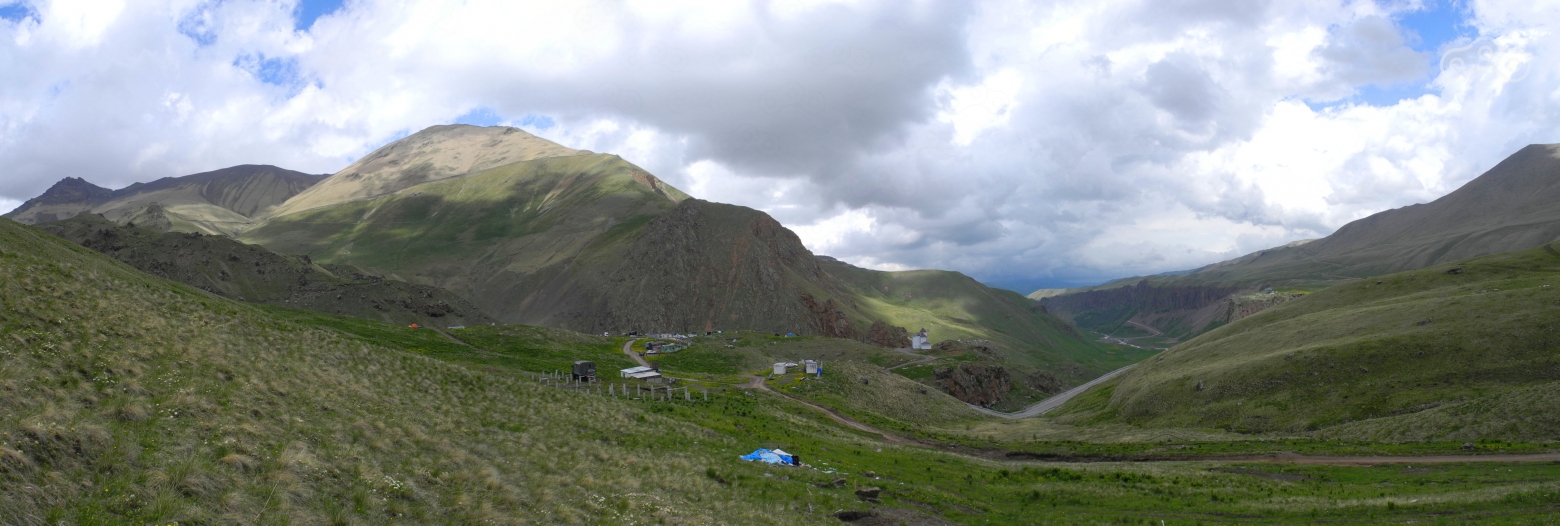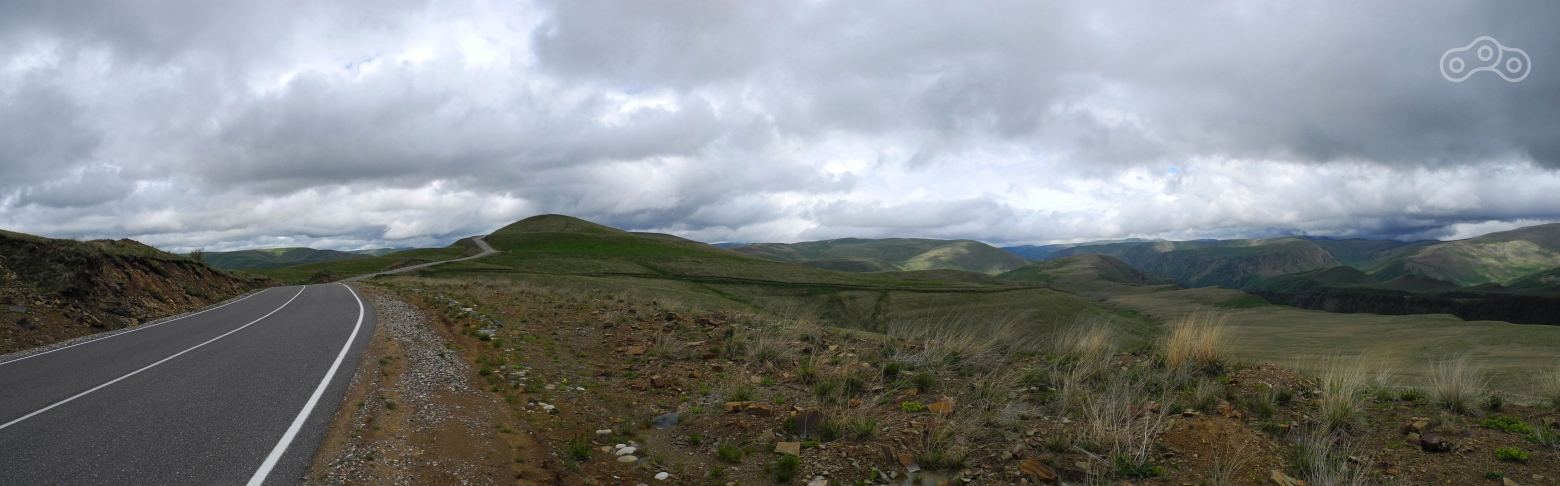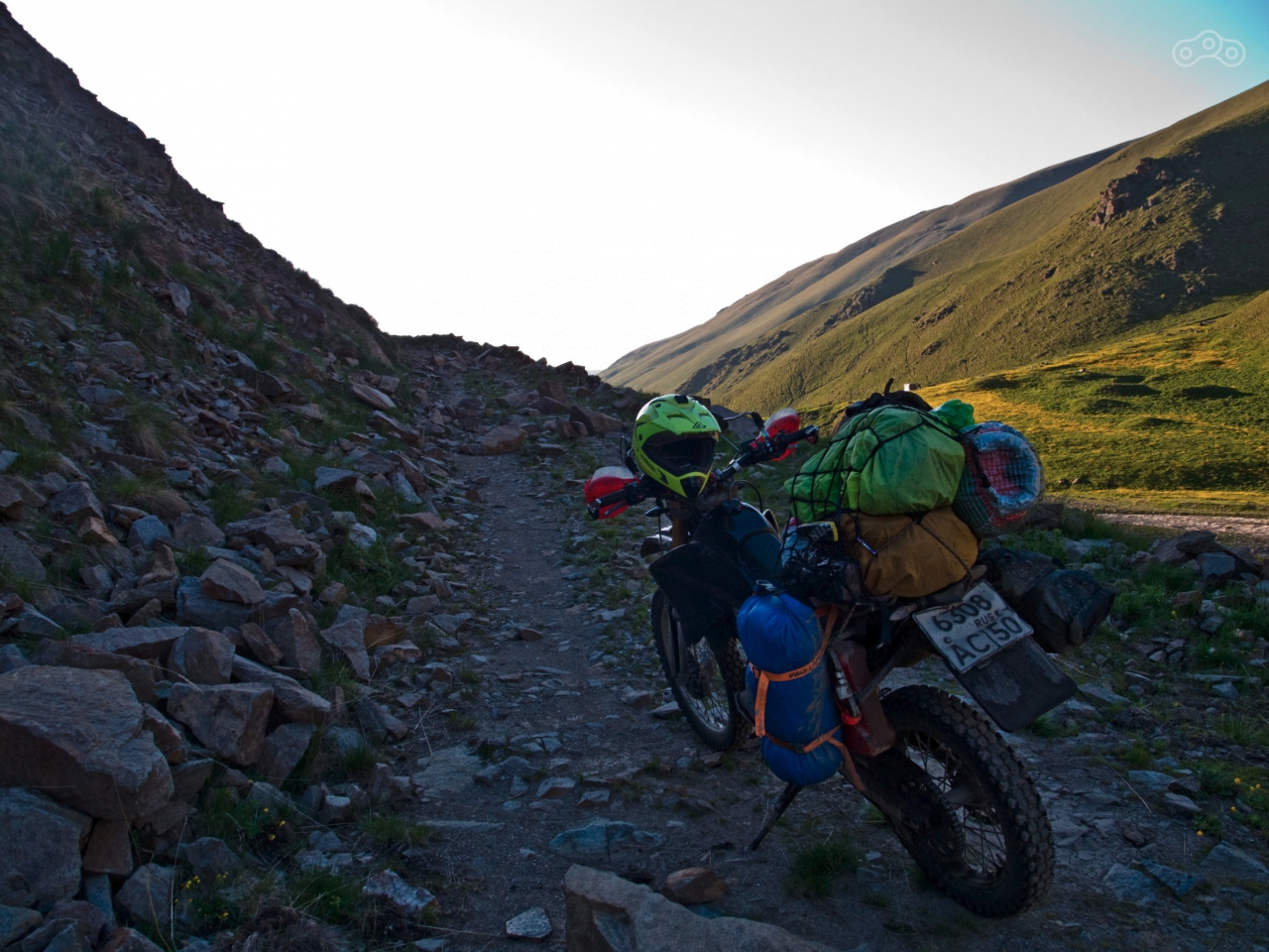 Я сделал очередной «перекур», чтобы перекусить и переодеться. Высота приближалась к 3000 метрам над уровнем моря и становилось прохладно. Пока я жевал булку и одевался, вокруг бегали многочисленные суслики (вполне обычного для сусликов размера). Я забрался на самую вершину перевала. Каково же было моё удивление, когда я увидел там безмятежно лежащих на газончике двух чёрных как смоль коров. Они повернули голову в мою сторону, не прекращая меланхолично жевать траву вперемешку с мелкими желтыми цветочками. Я посмеялся ситуации, напомнившей мне мультфильмы из детства, и стал спускаться. Укатанная дорога вела в основном вниз с небольшим уклоном, ехать было не сложно. Только изредка попадались размытые ручьями фрагменты дороги, на которых пришлось изрядно попотеть.