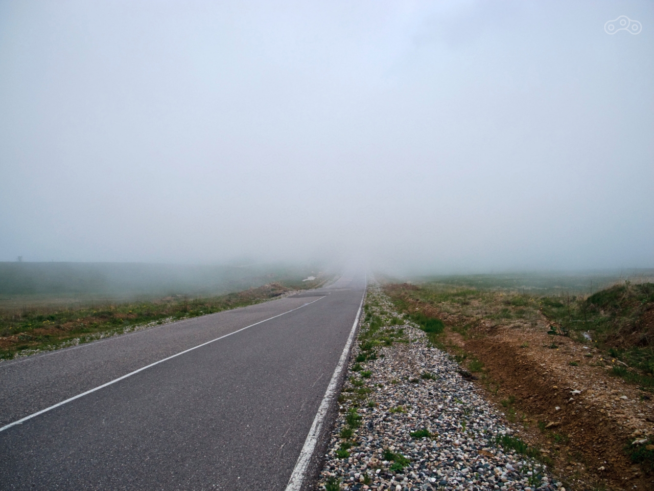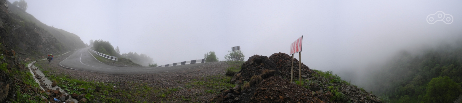 Дорога уже не так удивляла крутизной поворотов, хотя крутизна-то не изменилась, просто мне они уже стали более привычными. На втором перевале дорогу накрыло облаком, и я въехал прямо в него. Дорога эта не особо оживлённая, но мне повезло, я повис на хвосте у ехавшей впереди Volvo XC90 с казахскими номерами, поэтому всегда знал заранее, где надо замедлиться, а где можно ускориться. Навигатору веры больше не было, по крайней мере в горах. Через какое-то время в зеркале заметил Шкоду, она в свою очередь уже повисла на хвосте у меня. Ехать по облаку было мокро, вся одежда быстро пропиталась водой, висевшей в воздухе. Асфальт тоже был весь мокрый. Ощущения на самом деле не сильно отличаются от езды по очень густому туману, а по туману я ездил уже не раз. На вершине перевала в облаке вокруг дороги паслись лошади, которые провожали меня взглядом. Я сразу вспомнил знаменитый мультфильм Норштейна «Ёжик в тумане». Очень хотелось остановиться сфоткать, но обочины не было, а сзади шла машина. Вообще лошади на Кавказе мне попадались часто, но я всегда старался мимо них на холостых проезжать, потому что они частенько пугались звука моего мотора.