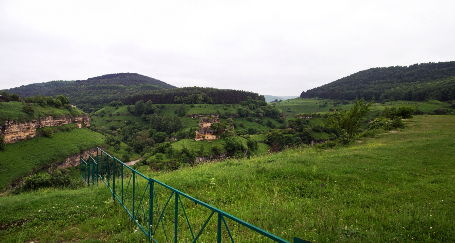 Всего по пути на Кисловодск перевалов было, если не ошибаюсь, четыре, и два из них были покрыты облаками, а внизу при этом было сухо. Правда после такого количества подъёмов и спусков с большим перепадом высот у меня разболелась голова. На спуске с последнего перевала, уже на подъезде к Кисловодску, идеальный асфальт внезапно кончился, превратившись во в хлам разбитую смесь асфальта и щебнево-грунтовой подушки. Это была граница между КЧР и Ставропольским краем. Если бы асфальта там не было совсем, ехать было бы намного проще. Хорошо, что хоть сухо было. Дальше я ехал аккуратно, старательно выбирая траекторию, потому что даже на эндуро на такой дороге жестко трясло, а вылететь в кювет из крутого поворота желания не было. В очередном повороте меня на большой скорости, подняв облако пыли, обогнал местный житель на белой шестёрке, проходя поворот с заносом, как настоящий раллийный гонщик. Проезжая посёлок Индустрия, я видимо где-то не туда свернул, потому что случайно заехал в так называемые «Лермонтовские места», где М.Ю.Лермонтов жил во время ссылки. Очень понравился, как фотографу-любителю, живописный каньон с пещерами возле города. Как сказал Роман, тут кругом сплошные плато и стоянки древнего человека.