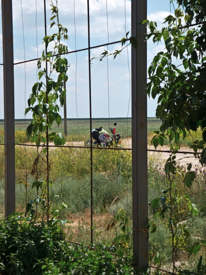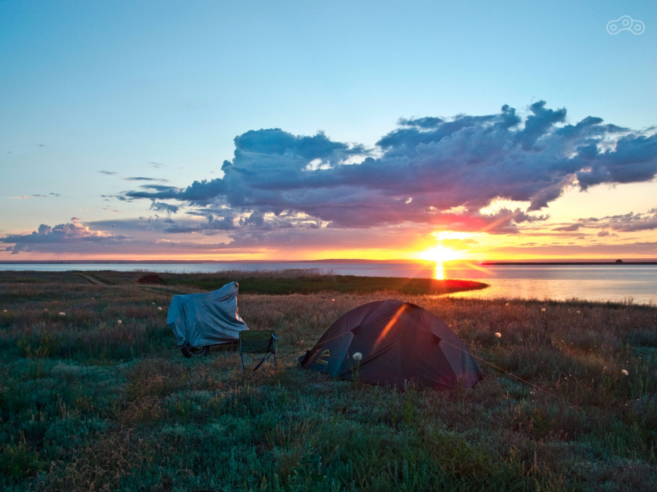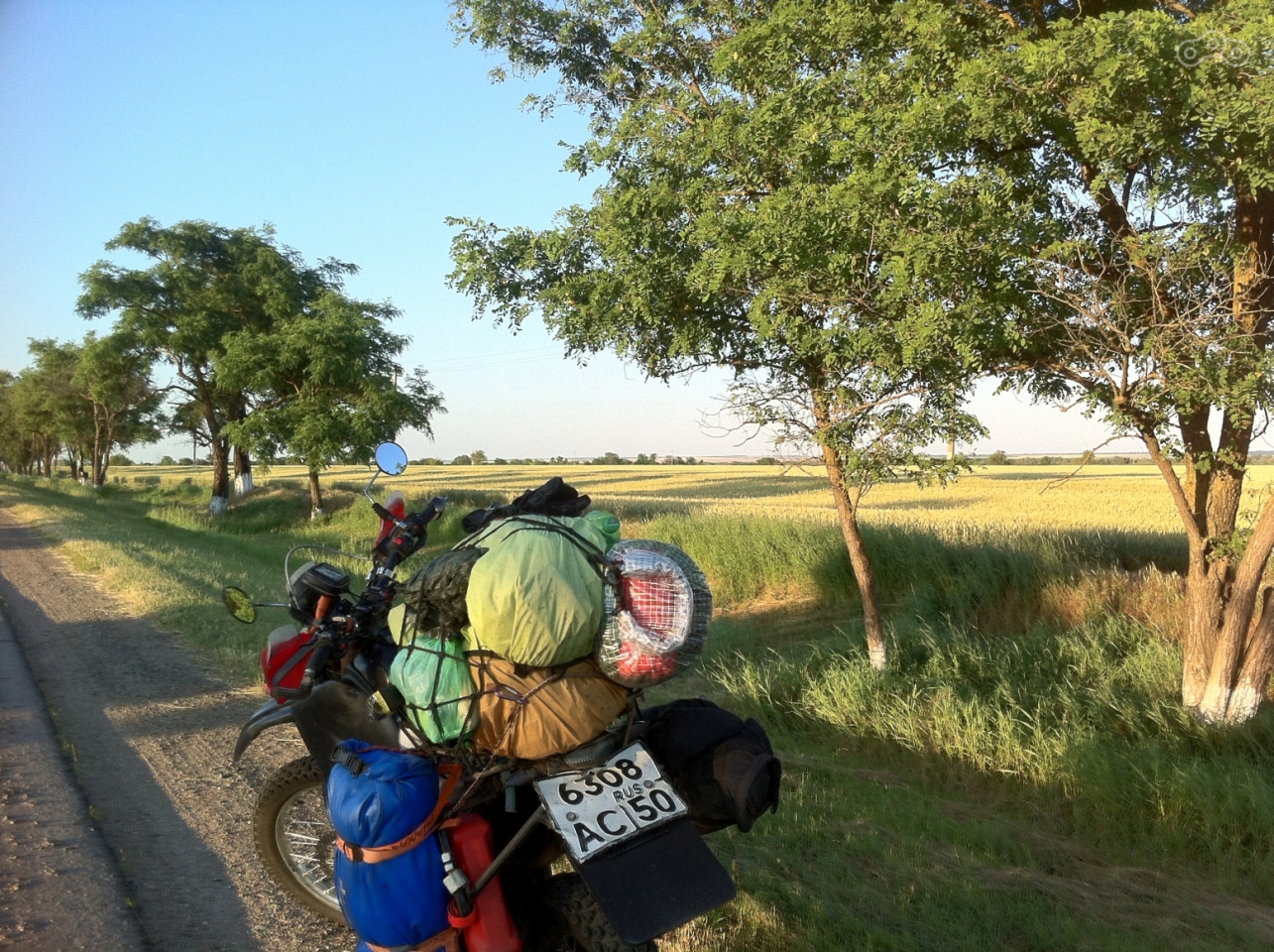 На выезде из города передо мной тащилась 15 км/ч фура и очень сложно было ехать за ней – она жутко воняла чёрным дымом из выхлопной трубы. Но я не решался обгонять, потому что дорогу не было видно из-за рельефа, тем более через сплошную. И правильно сделал, что не стал обгонять, потому что впереди оказался пост ДПС. Инспектор, когда меня увидел, машинально потянулся к полосатой палке, но увидев камеру на шлеме, передумал. Я теперь всё время ездил с камерой, дабы избегать общения с сотрудниками ГИБДД. Она правда была выключена, но издалека этого не видно. Единственное, что очень напрягала ухудшившаяся аэродинамика шлема – очень уставала шея от борьбы с ветром. Сразу за городом я повернул в сторону Элисты, проехал буквально десяток километров и увидел слева поле, до которого от дороги был широкий кусок земли, поросший высокой почти по пояс травой и невысокими кустами и деревьями. Солнце уже давно село, оставив красноватое зарево на горизонте, и я решил, что расположусь здесь. Я нашёл местечко, которое было не сильно видно с дороги, и с фонариком в зубах, утрамбовав немного траву, поставил палатку. На удивление связь была отличная, но я так вымотался за день, что быстро уснул, скинув лишь координаты своего места ночёвки близким.