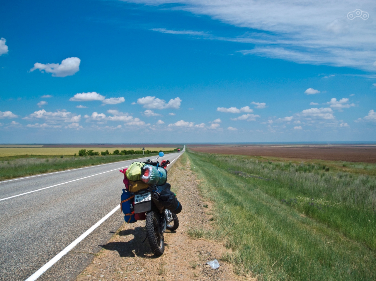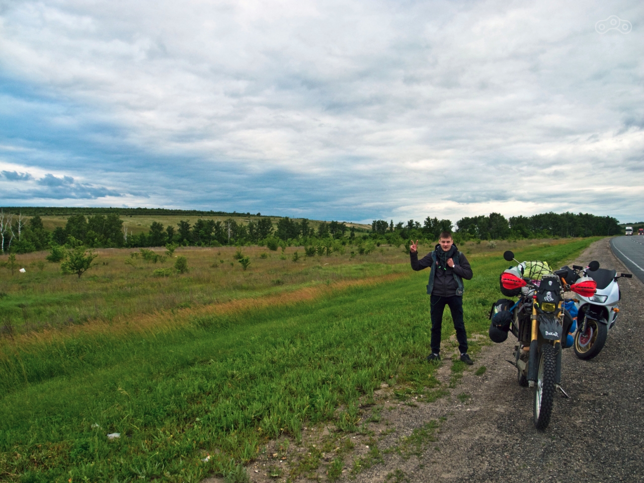 Выехав из города, я вышел на трассу М6 и направился в сторону Волгограда. Калмыкия севернее Элисты уже несколько отличалась от более южной части. В степи появилась более частая, хоть и такая же низкая, растительность, а дороги уже были ровные и нормального качества. Но всё было такое плоское, что видно было вокруг на многие километры. Очень контрастно было после гор Кавказа. Впереди виднелись явные признаки дождя, поэтому я сделал остановку на автобусной остановке, чтобы продумать дальнейший план действий – зачехляться ли в дождевик или попробовать объехать дождь, как делал уже не раз. Это такая игра – убеги от дождя. Я часто так делаю. ))) На остановке оказался маленький чёрный игривый щенок, который настолько хотел играть, что я даже на него пару раз случайно наступил, пока расхаживал, ковыряясь в мобиле. Я нашёл в мусорном контейнере пластиковую бутылку, обрезал её и налил в неё воды, а также дал щенку немного белого хлеба – больше у меня ничего из еды не было. Но ему больше хотелось играть, чем есть. Пока я ковырялся в интернете, щенок умудрился нахватать целых трёх клещей, которые надувались от выпитой крови прямо на глазах. Клещи в степи просто кишмя кишат, буквально видно, как они бегают под ногами. Причём они не привычно красные, а пятнисто-чёрные. Я понял, что идея с ночёвкой в палатке в степи не очень хорошая. А значит надо было ускоряться – солнце уже клонилось к горизонту. Позже эту мысль мне подтвердили в одной из придорожных калмыцких гостиниц (номер 2000 рублей). Я провёл щенку «операцию» по удалению клещей (руками вытащил), вымыл на всякий случай руки бензином, сел на мотоцикл и помчал дальше, пока не пришла в голову какая-нибудь дурацкая идея, типа «забрать щенка с собой до ближайшего города». Бросать его там конечно было очень жаль, но тащить с собой тоже не вариант. Под дождь впереди я всё же попал, правда дождь был скорее мелким накрапыванием. Но в калмыцкой степи хватило и этого. Я имел глупость проигнорировать табличку на обочине «Во влажную погоду на обочину не съезжать», в результате все колёса и ботинки у меня покрылись рыжей глиной, в самый раз для производства кирпичей. Кстати их там и делают - по пути я видел кирпичный завод. Удивило, что за всё время я видел всего одного верхового – по степи нёсся галопом всадник. Калмыкия всегда у меня почему-то ассоциировалась с верховой ездой.