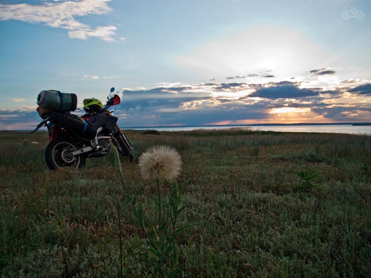 Возвращаться 50 км назад мне не хотелось, поэтому я сверился с картами в телефоне и решил ехать пока по правому берегу до города Энгельс, а там перебраться на левый берег и оттуда выйти на М5. Однако планы пришлось поменять. Когда я доехал до переправы через реку Яруслан, правый приток Волги, то оказалось, что переправа не работает. Не только сегодня, а вообще в принципе не работает. Можно конечно было попробовать объехать вокруг через Палласовку, но я решил оставить этот вопрос на утро. К этому времени уже вечерело и нужно было думать о ночлеге. Я прокатился пару сотен метров вдоль берега и увидел двоих рыбаков в болотных сапогах, которые рыбачили, стоя по пояс в воде. Я спросил у них, как в этой местности с клещами. Рыбак мне ответил «Так они везде есть. Но у нас они не опасные, не энцефалитные». Причём ответил он это таким спокойным тоном, что у меня окончательно отлегло, и я решил, что буду ночевать именно здесь. Я чуток отъехал от рыбацкого лагеря, и стал ставить палатку. На левом берегу Волги тем временем солнце зашло за горизонт, освещая красным заревом холмы и отражаясь в реке. Луг, где я расположился, поразил огромных размеров одуванчиками, я таких никогда раньше не видел. Клещи тут действительно были, я потом на себе поймал одного прямо в палатке, но не так много как в степях Калмыкии. Так же были комары, но приятный ветерок в сторону реки большинство из них сдувал, и они забавно парили в воздухе, как птицы парят на потоках воздуха, вместо того чтобы роиться и кусать. Перед тем, как лечь спать, я ещё немного посидел на стульчике возле палатки, провожая последние отблески заката. Место было тихое и спокойное, навевало умиротворение. Особенно на контрасте после Волгограда.