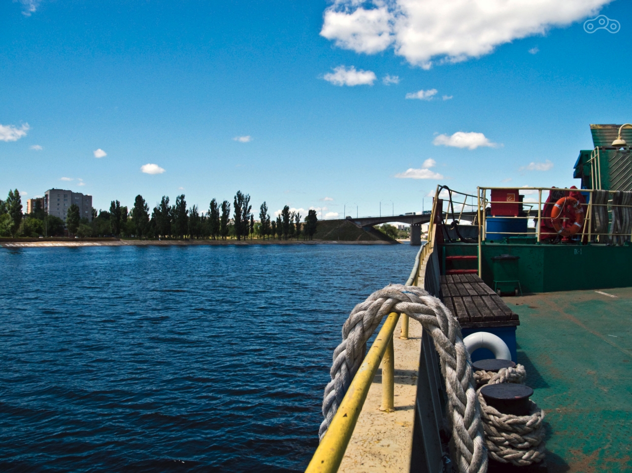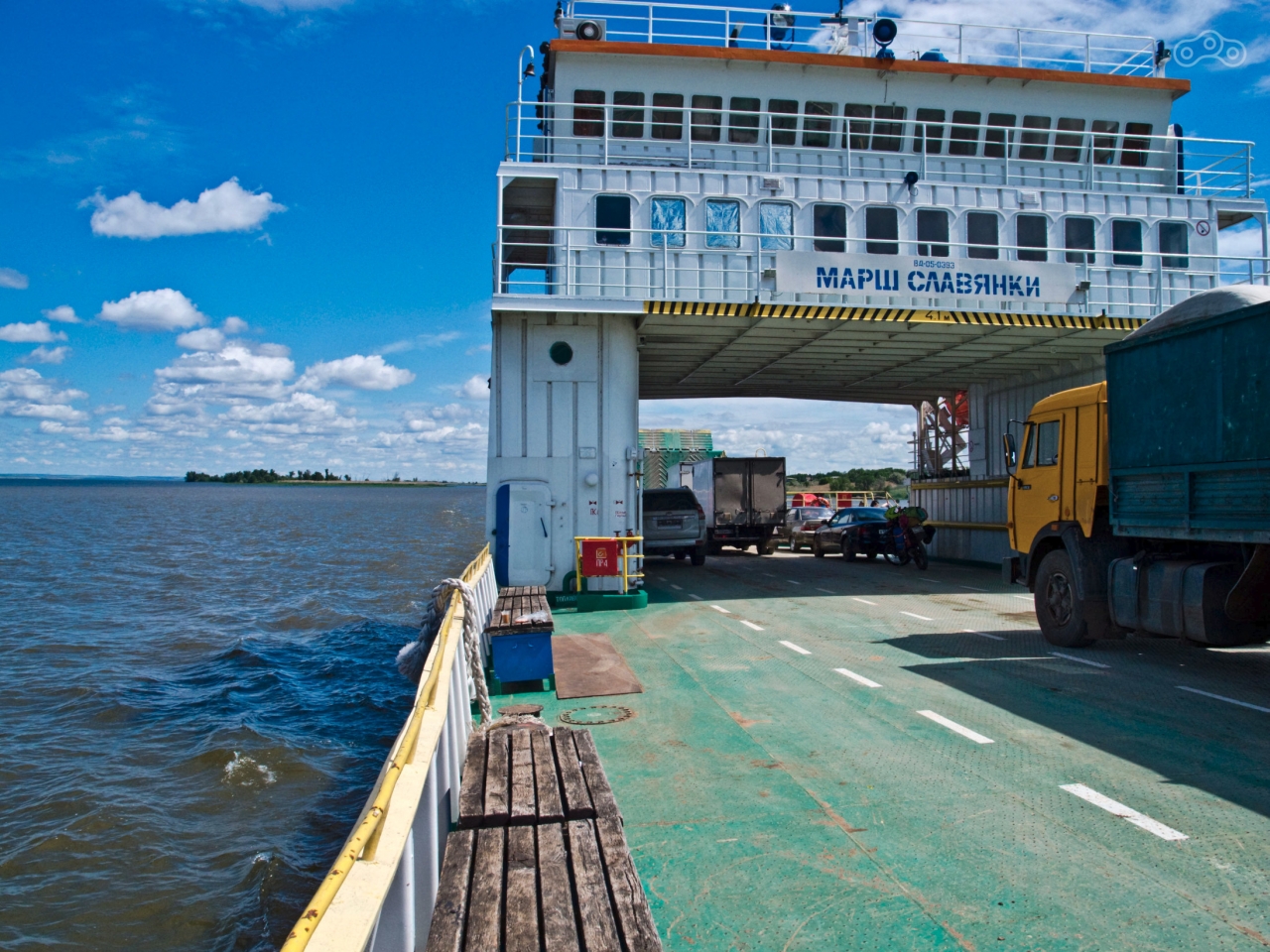 Утром я проснулся как всегда рано, и пока было свежо, стал сворачивать лагерь. Новым планом было вернуться до Николаевска и на пароме перебраться в Камышин. Я нашёл в интернете расписание паромов – старого и нового, и ориентировался на отплытие в час дня. Я на удивление удачно расчитал время, приехал к паромной переправе буквально за 15 минут до отплытия. Правда отплыл паром не совсем по расписанию, а минут на 10 позже. Там есть два парома – старый и новый. Старый (и ржавый) паром расчитан на более тяжелые ТС, стоит дороже и берёт дополнительную плату за пассажиров. Новый паром «Марш Славянки» мне обошёлся всего в 200 рублей. Причём тётенька, заведующая погрузкой, оказалась весьма неадекватно настроена, я уж не знаю ко мне лично или вообще в принципе. Всё что она мне отвечала на мои глупые вопросы, я ведь впервые на пароме переправляюсь, можно было ответить в совсем другой, более приятной форме. Правда как только мы отплыли, я тут же об этом забыл. Я купил на пароме пару пирожков и кофе, и уселся у борта, разглядывая волны. Плыли мы около получаса, после чего пришвартовались где-то в промзоне. Я выехал из промзоны, заехал на АЗС Лукойл, чтобы заправиться, но там была большая очередь. Тогда я проехал чуть дальше и увидел кафе Смак. Там я остановился, чтобы полноценно позавтракать и посмотреть, что за ерунда у меня творится с зарядником навигатора. При ближайшем рассмотрении оказалось, что за время путешествия внутри прикуривателя всё слегка проржавело. Видимо от конденсата, потому что закрыт зарядником он был вроде довольно плотно. Я вычистил максимально ржавчину, снова заехал на ту же АЗС, на этот раз более удачно, и взял направление на Самару по P-228.