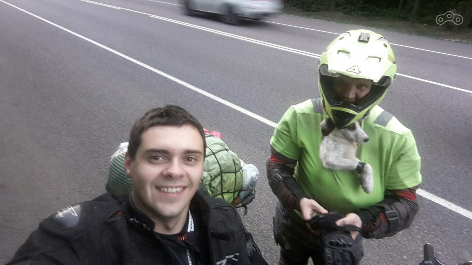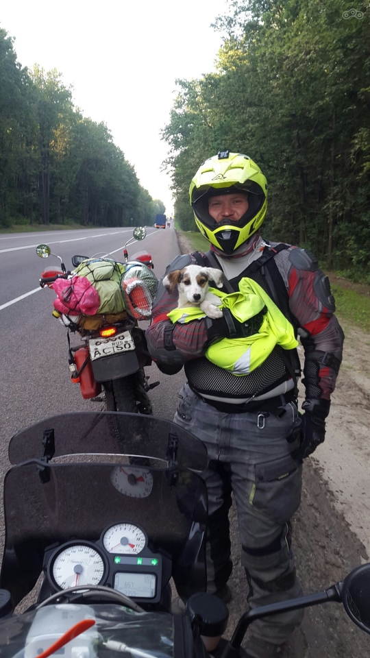 Я его погладил и стал думать, что с ним делать. Оставлять его там было нельзя. Что в Тульской, что в Орловской (в меньшей степени) областях дороги узкие и обычная практика съехать на обочину, чтобы пропустить более быстро идущий поток. Поэтому шансов оказаться под колёсами у него было не мало. Попытка усадить его между коленей на бак, как я видел в видео на Ютубе, успеха не принесла. Как только я тронулся, он тут же спрыгнул обратно на обочину. Я слез с мотоцикла и стал думать, как же мне его зафиксировать. Однако специфика моего мотоцикла практически не оставляла вариантов. Я стал смотреть по сторонам, вдруг решение придёт само. И оно пришло! Мимо проезжал мотоциклист, весь покрытый мошками. Он остановился и подъехал ко мне. Выяснилось, что он местный, орловский, но едет из Москвы. Мы покумекали вдвоём. Я снял желтую футболку и завернул щенка в неё, однако сев на мотоцикл быстро понял, что ехать управляя одной рукой не смогу – будут проблемы с троганием и остановкой.