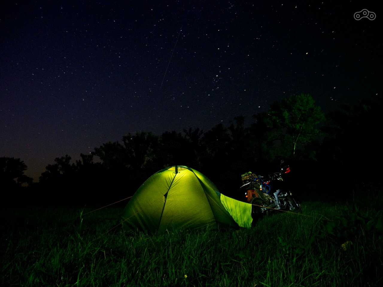 Ночью в Орле обещали +20°C, а утром и днём жару без осадков. Я подумал, что в +20°C можно даже спальник не распаковывать, и улёгся спать. Однако сон не шёл. Со стороны деревни раздавались звуки тракторного двигателя и газонокосилки, а с соседней поляны доносилась громкая музыка и крики. Периодически сквозь туман вдоль холма с криками «Йууууухууууу!» и рычанием прямотоков проносился туда-сюда паркетный внедорожник. Немного поворочавшись, я вылез наружу и стал баловаться с фотоаппаратом. Ночная съёмка очень увлекательное и времязатратное занятие, так что два часа пролетели незаметно. Туман то заволакивал поляну, то снова исчезал. Небо было покрыто мириадами звёзд, даже очень мелкие из них были видны. Пока я возился с фотоаппаратом, я краем глаза несколько раз замечал в траве вспышки света. Сначала я подумал, что это светлячки. Но потом вспомнил, что видел светлячков во время ночёвки на Верхней Мамедке, и они вели себя совсем иначе. Они не сверкали, как вспышки, а светились, как летающие фонарики, перелетая с травинки на травинку. А потом я внезапно понял – это были отражения в каплях росы от «падающих звёзд». Давным давно в детстве я любил лежать в августе на капоте нашего древнего 408 «Москвича» и смотреть в небо, считая падающие звёзды. И в этот раз я не отказал себе в удовольствии посидеть на раскладном стульчике, глядя в небо.