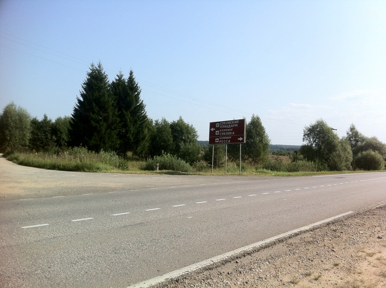 Где-то в начале третьего мы наконец стартовали в сторону Обнинска, потолкались там немного в пробках, после чего вышли на трассу в сторону Медыни. Чем хороша старая Варшавка, она хоть и узкая, но машин на ней не так уж много, и средняя скорость потока не сильно отличается от моей. Кто-то едет чуть быстрее, а кто-то наоборот чуть медленнее. Стояла неимоверная жара. Меня почему-то разобрало побезобразничать, поэтому я периодически обгонял поток по грунтовой обочине, пользуясь преимуществами мотоцикла эндуро, при свободной в общем-то встречке. Впрочем, в баловстве тоже надо знать меру, поэтому на подъездах к Медыни я уже успокоился, и дальше мы ехали по правилам. Проехав через город, мы сделали остановку. Время уже клонилось к вечеру, поэтому я посмотрел альтернативный маршрут. Но более короткий маршрут требовал довольно прилично вернуться назад, поэтому мы решили продолжать путь, а там решать по обстоятельствам.