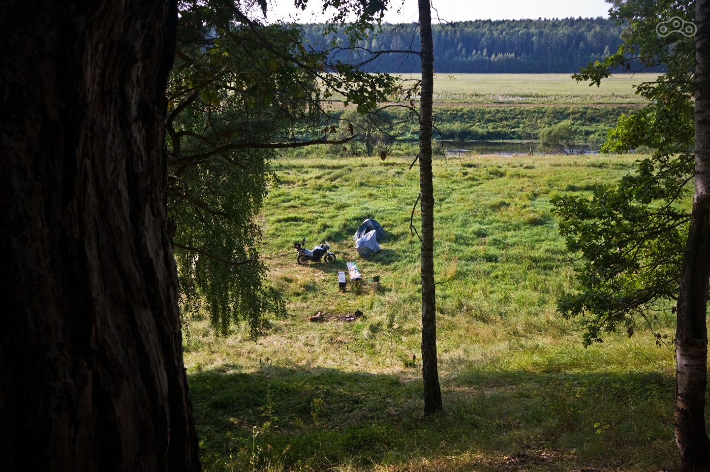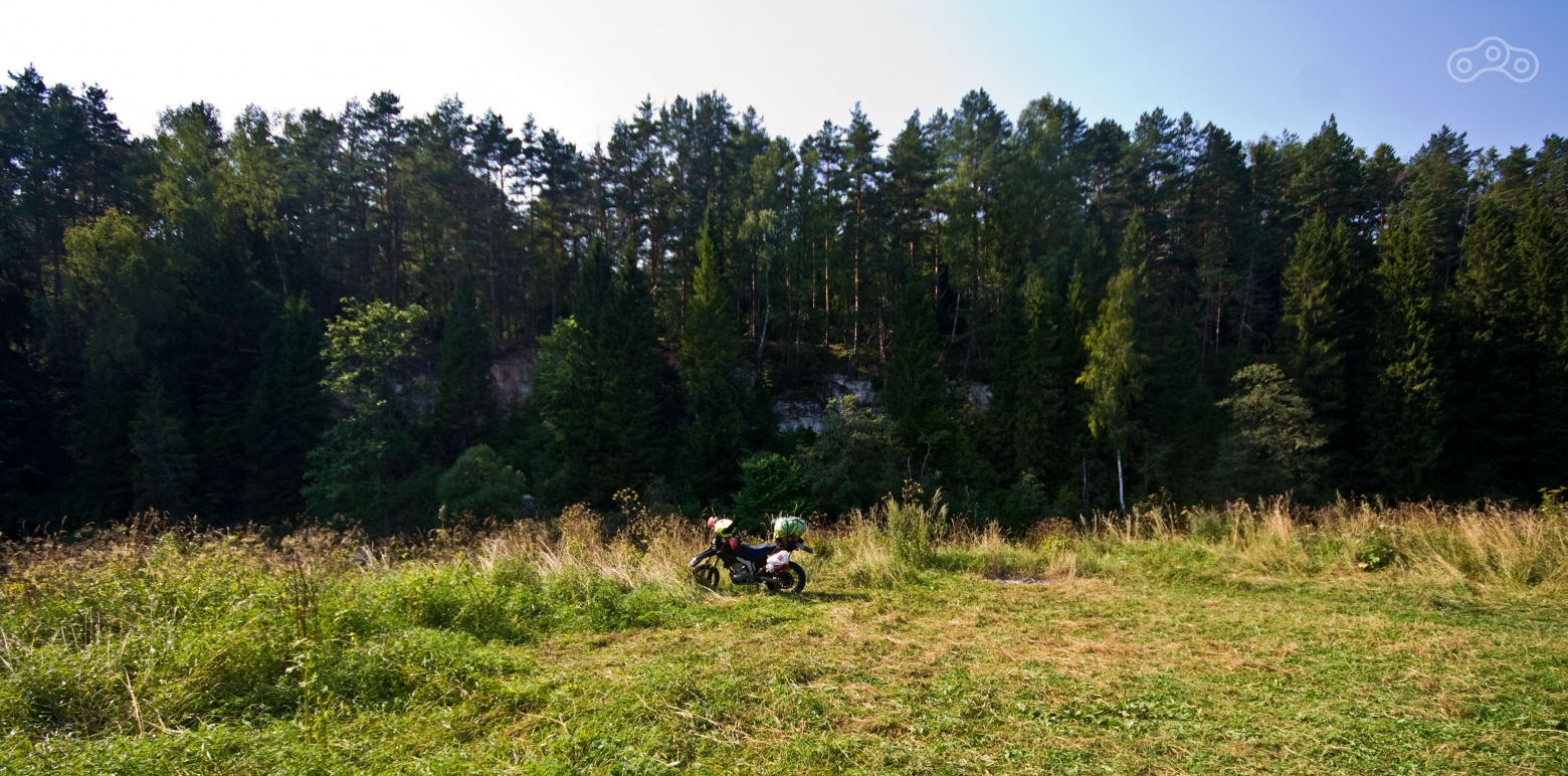 Время было уже полседьмого, никаких шансов доехать до Дёржи засветло с моими-то скоростями уже не оставалось. Я предложил закупиться едой и немного вернуться назад, где мы видели стенд с указателем на кемпинги возле моста через реку Ресса. Диляра сказала, что можно сначала сгонять на разведку, потом вернуться за едой. Я не стал спорить, и мы немного вернулись назад. Доехав до стенда, я оставил Диляру на дороге и проехал вдоль берега реки в поисках хорошего места. Интересный момент, что на стенде было что-то написано про оплату места в кемпинге, но нигде не было видно никакого пункта или человека, которому следовало платить. Мы доехали до первой «официальной» полянки и расположились там. Официальной поляну по всей видимости делало наличие столика с лавочкой и кострища (на более дальних полянах были ещё беседки).