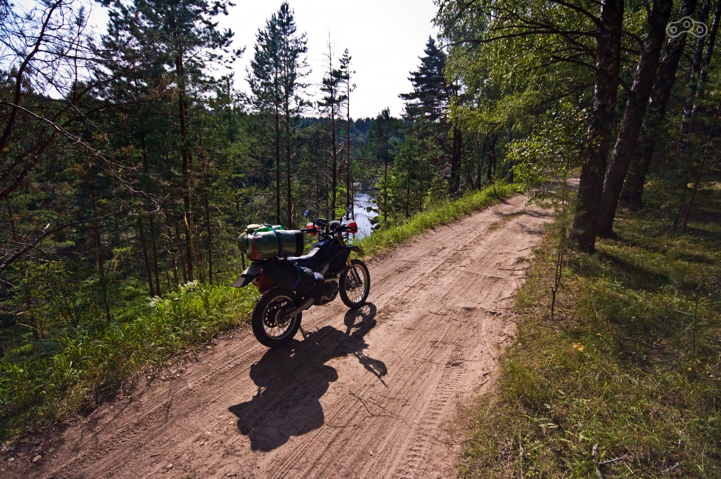 Поев, я продолжил путь в сторону Зубцова. Дорога вывела прямо в город, и в самом городе качество дорог оказалось ещё хуже, чем за его границами. Кое-как проехав через эти ямы, именуемые дорогами, я вышел на второстепенную довольно качественную дорогу и помчался вдоль реки Волга. После Мозгово я свернул на грунтовку через поле и приехал на то место, где бывал уже несколько лет назад – обрыв над рекой Дёржа. Наверху стояли две машины, а вниз вёл довольно крутой испещрённый корнями спуск, по которому я в прошлый раз съехать не рискнул. Однако в этот раз спуск не показался мне чем-то сложным. В горах Кавказа я ездил дорожки и покруче. Я спустился вниз и доехал до реки. Там в воде плескались две компании, судя по разговорам одна с Украины, другая из Москвы. Жара стояла неимоверная, стоять на месте в экипировке было откровенно тяжело. Я намочил в водах реки свой баф, повязал его на шею и полез обратно наверх. Подъём тоже не показался сложным, благо износившийся в дальняке задний баллон я уже переобул. Я прокатился вдоль реки по накатанным грунтовым колеям, но как и в прошлый раз дорога внезапно кончилась посреди поля. Фрирайдить не хотелось, да и резина у меня не самая удачная для езды по пашне, так что я вернулся в Мозгово и не доезжая до Зубцова вышел на трассу М9 в сторону дома.