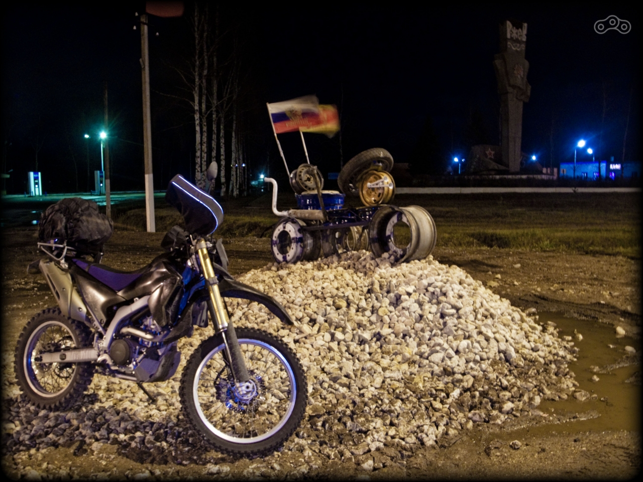 Периодически я делал остановки, т.к. нужно было «размять булки». До Ржева я докатился как-то даже незаметно, заправился на АЗС Сургутнефтегаз. Мотоцикл на этом бензине ехал хорошо, мотор работал ровно и мягко. У самого поворота я внезапно увидел нагромождение камней и деталей – скульптуру чего-то типа трайка в стиле стим-панк. Я подъехал к ней, чтобы запечатлеть, и буквально через минуту ко мне подошёл местный мужичок, который, как оказалось, был создателем сего произведения. Более того, он его только выставил, так что моё фото было своеобразной премьерой. Мы немного пообщались. Как оказалось у него тоже есть два мотоцикла – китайский «эндурик» и что-то неопределённое о 350 кубах. Он пожелал мне ни гвоздя, ни жезла, и я покатил в город Ржев, т.к. возвращаться пока не хотелось.