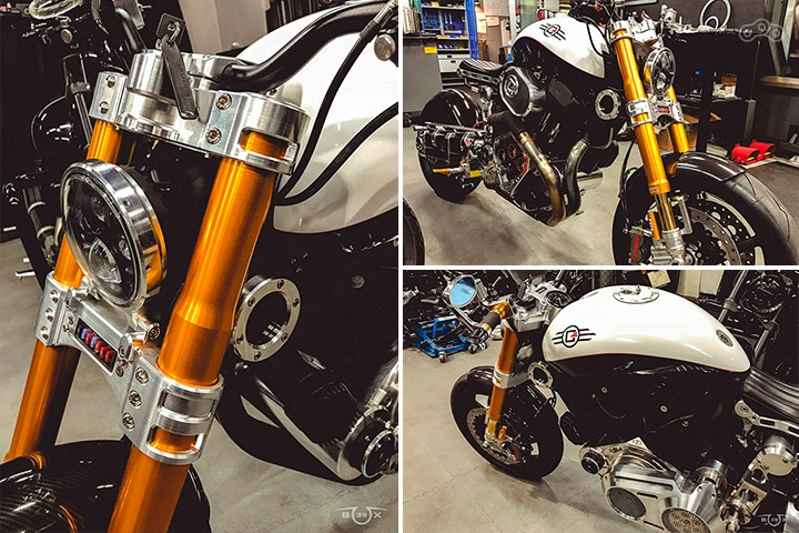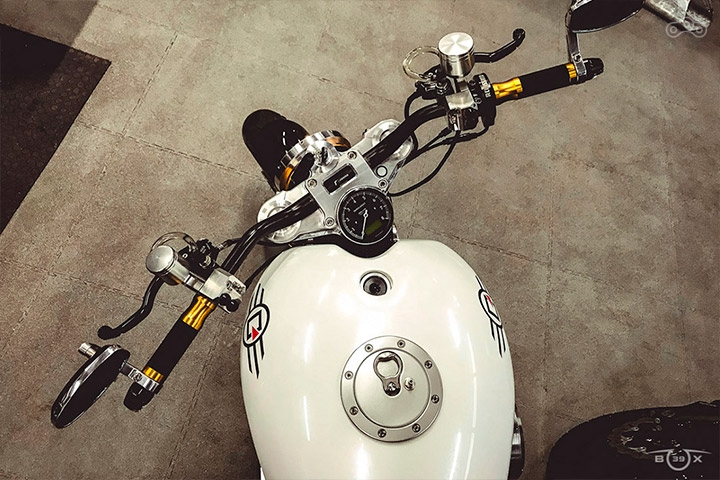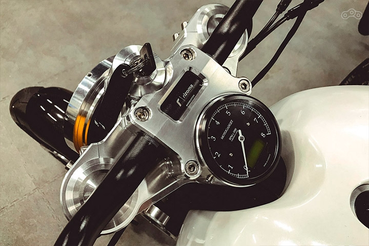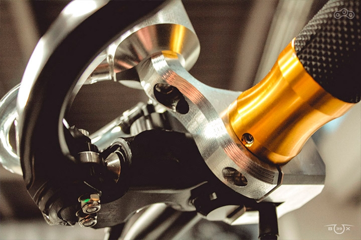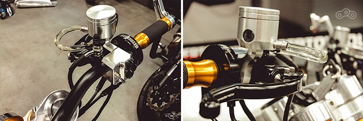 Еще одним бесспорным мотиватором уйти от стокового руля стала инженерная ошибка производителя. Тормозной бачок на данной модели эффектно объединен с креплением клипона на передней траверсе. Но стоит он слишком низко относительно тормозной машинки. При наклоне мотоцикла жидкость перетекает и система хапает воздух.