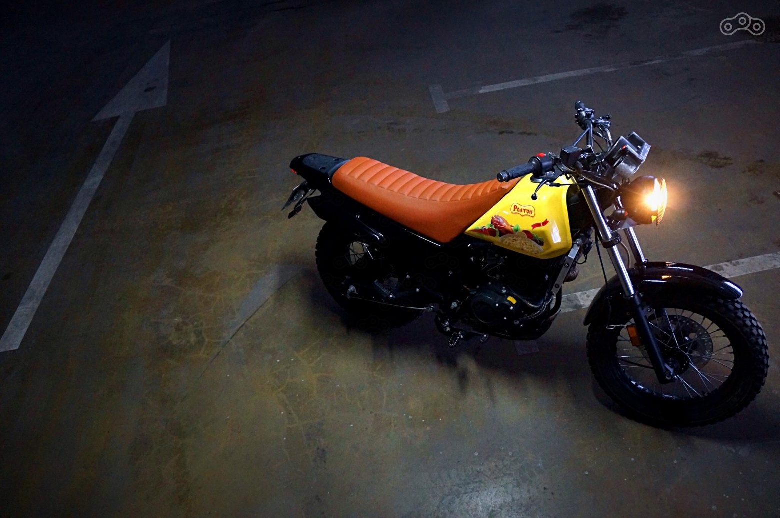 "Роллтон"! Да, именно то, что лучше всего передает дух всего происходящего в ту минуту. Азиатский до мозга костей мотоцикл, похожий на лапшу, залитую кипятком наших переживаний и желтый бак как идеальный фон для графики. Ее https://vk.com/galarose отрисовала по моим несвязным воплям и напечатала на белом виниле.