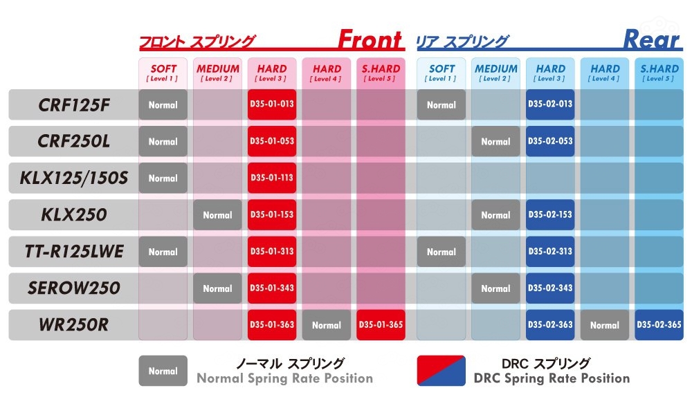 С пружиной для амортизатора тоже оказались свои нюансы. Теоретически существует пружина DRC D35-02-365, которая тоже маркирована как Level5 по каталогу DRC, однако её реальная жесткость всего 82 N/mm, что мало отличается от стока. Впрочем и купить её тоже непросто, она есть в наличии только на тайваньском Вебайке или Ракутене, а там всё на тайваньском/японском языке, английского нет. У Cannon Racecraft тоже есть пружина под наш мотик, но она почему-то имеет странные размеры, а главное изготавливается под заказ и стоит аж $139. Порывшись в каталоге, я обнаружил, что ВОЗМОЖНО к нашему мотоциклу подойдёт пружина 64220 (63.5x59.5x220 мм), позиционируемая для Honda XR400R/XR650L. Стоит она $100. Я уточнил у производителя, у этой пружины так же нижний виток заужен (reduced end), как и у нашей стоковой пружины.