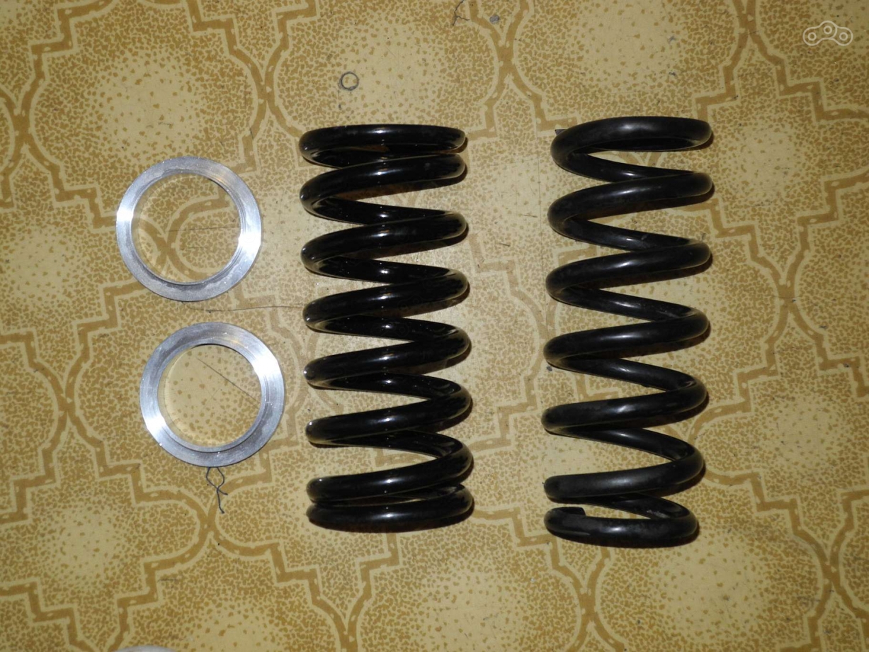 Отдавать ещё $100-150 за заднюю пружину мне оказалось не по карману, поэтому я пошёл по альтернативному пути - я решил поставить пружину от автомобильного койловера. Однако тут кроется важный нюанс. Стоковая пружина у нас имеет зауженный нижний виток. Я не знаю, как это отражается на работе подвески, но совершенно точно сделано это в том числе для того, чтобы пружина маятник не цепляла. Более того, стоковая пружина имеет чуть меньший, чем стандартные автомобильные 2.5", внутренний диаметр. Замеры показали 62 мм сверху, 58 мм снизу и свободную длину 222 мм. Перелопатив изрядное количество каталогов, я пришёл к выводу, что оптимальный вариант это 2.5"x8" или 2.5"x9"... Пружины 9” встречаются в продаже крайне редко, поэтому я остановился на 2.5"x8". Ещё один момент, что готовые каталожные автомобильные пружины не бывают на 91 N/mm, они как правило на 500 или 550 lb/in, то есть 87.5 и 96.3 N/mm. Поразмыслив и посоветовавшись с калькулятором, я пришёл к выводу, что 96.3 для меня многовато и решил остановиться на 500 lb/in. Как показала практика, я не ошибся.